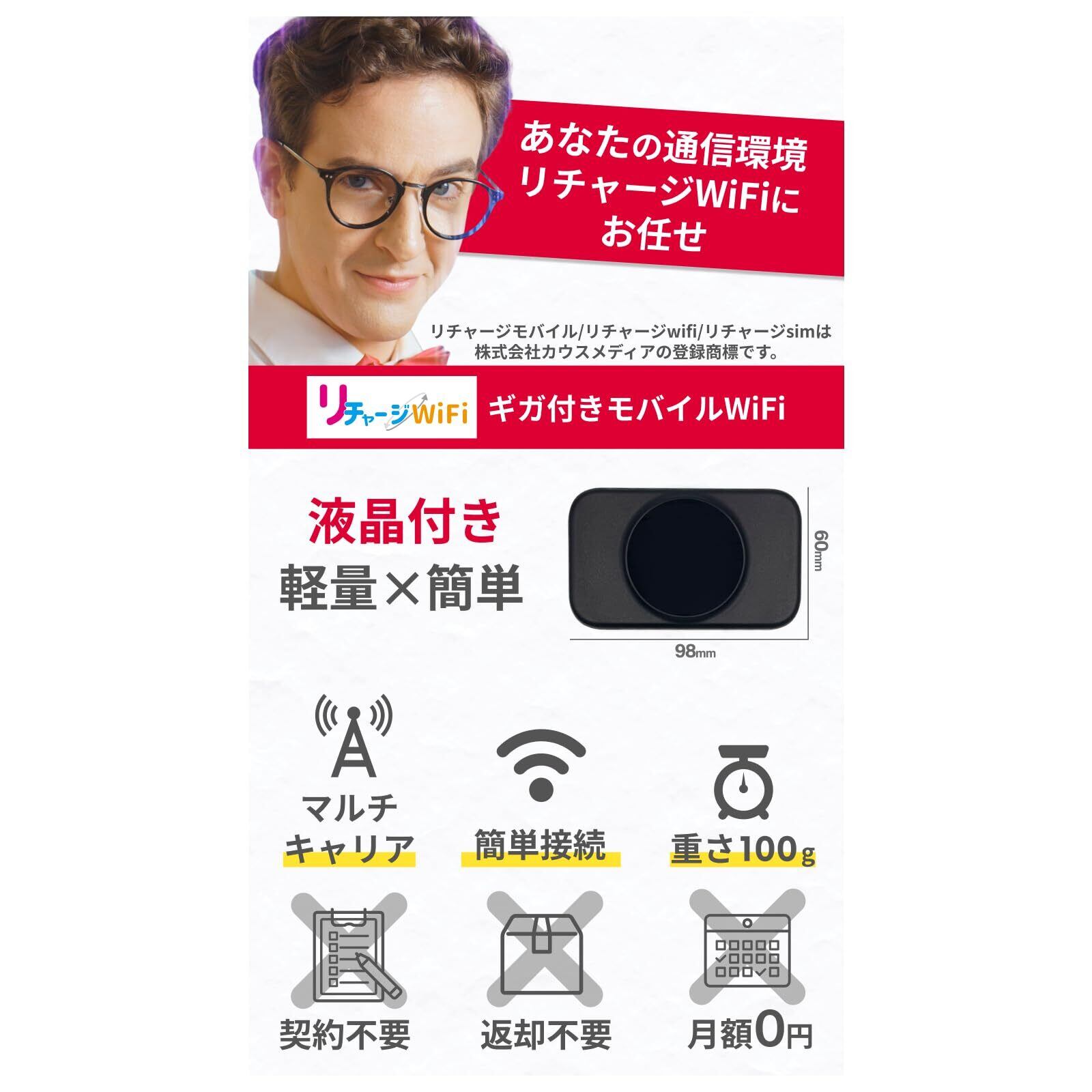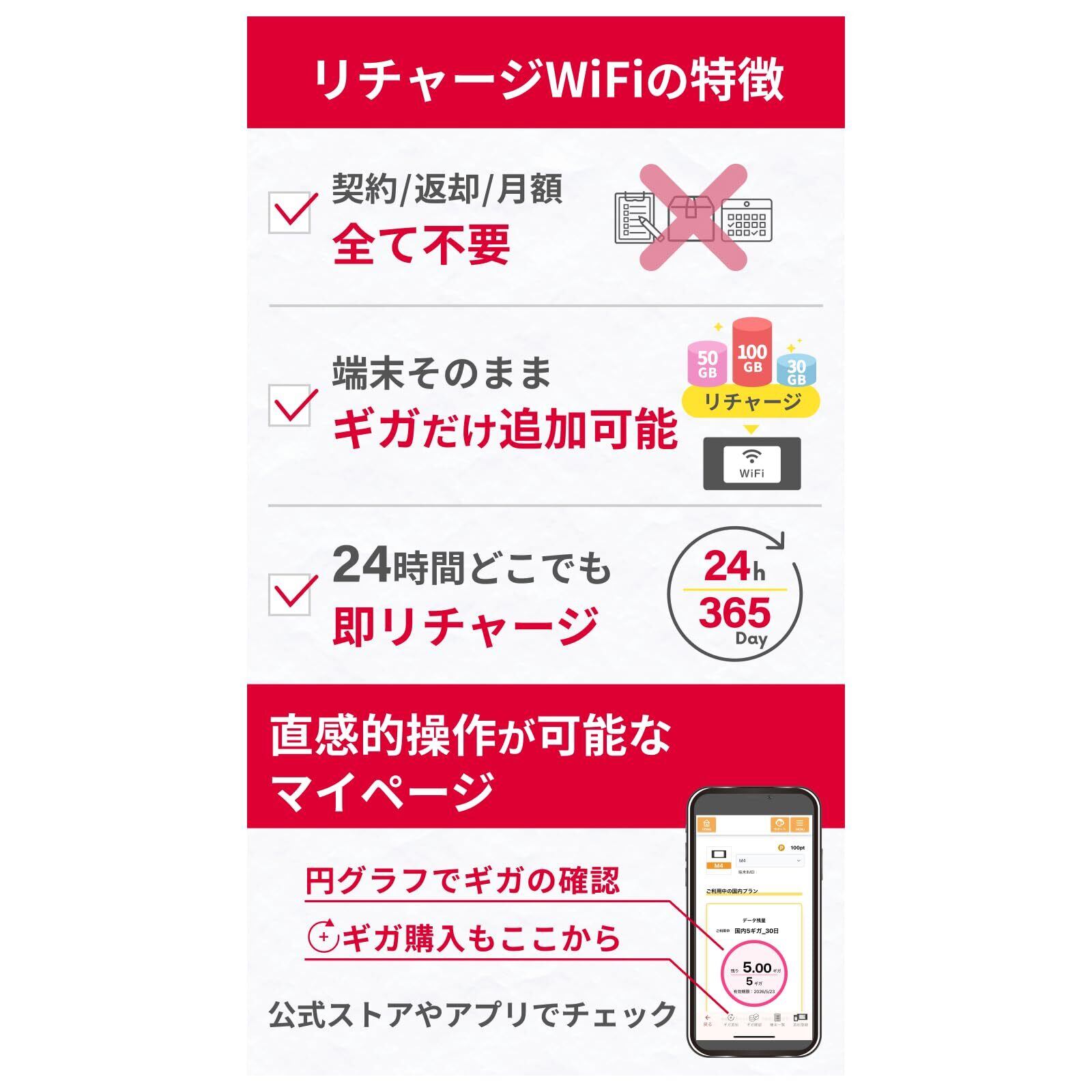 【リチャージWiFi】令和7年10月発売 100GB 間使える ギガ付 ポケット モバイル ルーター WiFi 契約無し 返却 無し 月額 0円 簡単ギガチャージ 電源ONで即時使える 小型 シンプル ロングバッテリー【T9BK-100GB/365日間】