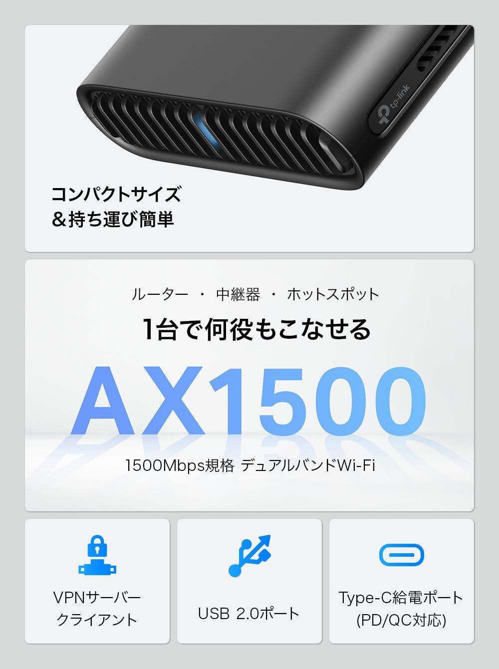 TP-Link WiFi 無線LAN ルーター トラベルルーター AX1500規格1201Mbps (5GHz) + 300Mbps (2.4GHz) 【7つのモード: ルーター USBテザリング / 3G/4G USBモデム/ホットスポット/アクセスポイント/中継器/クライアントモード 】ホテル 空港 カフェ WR1502X/A