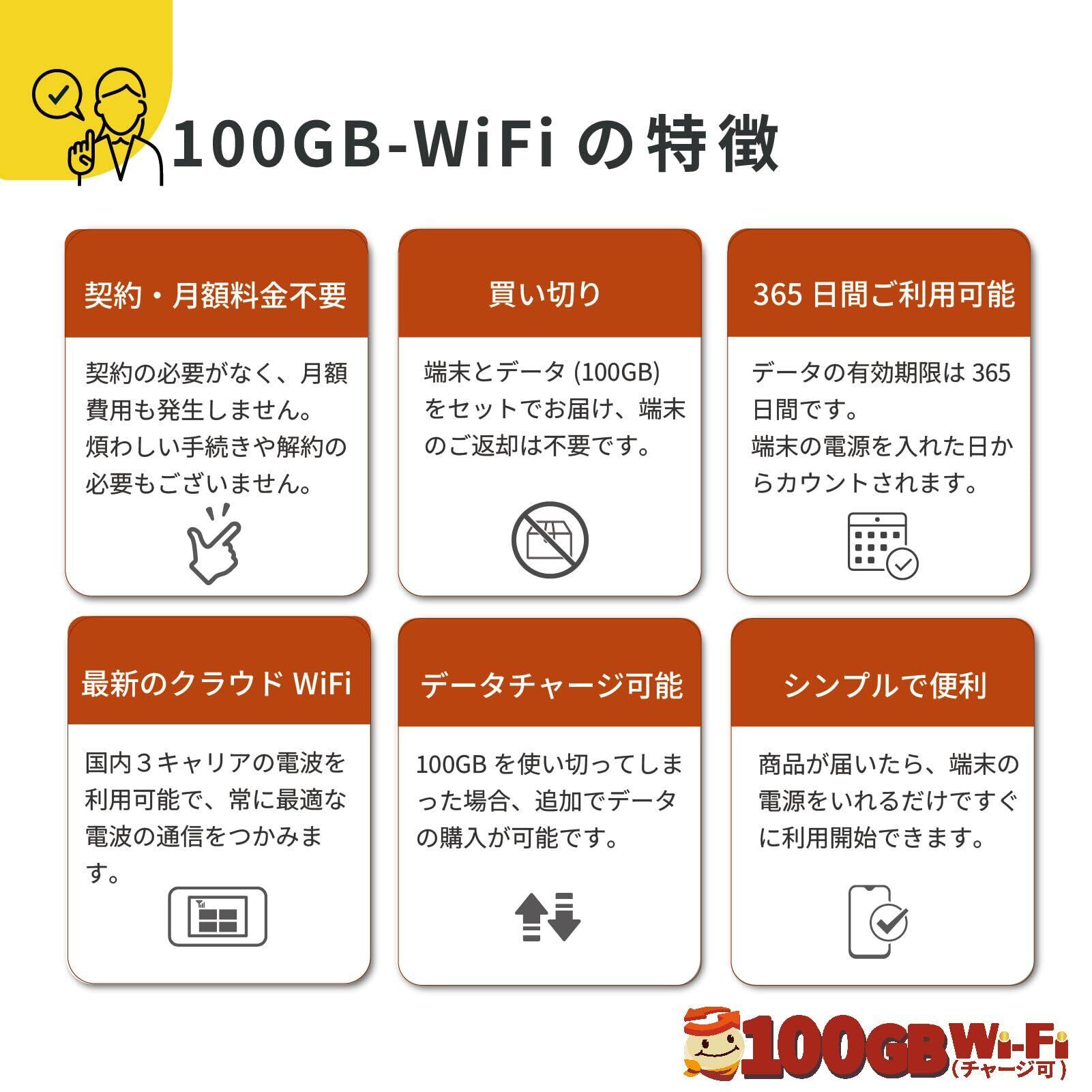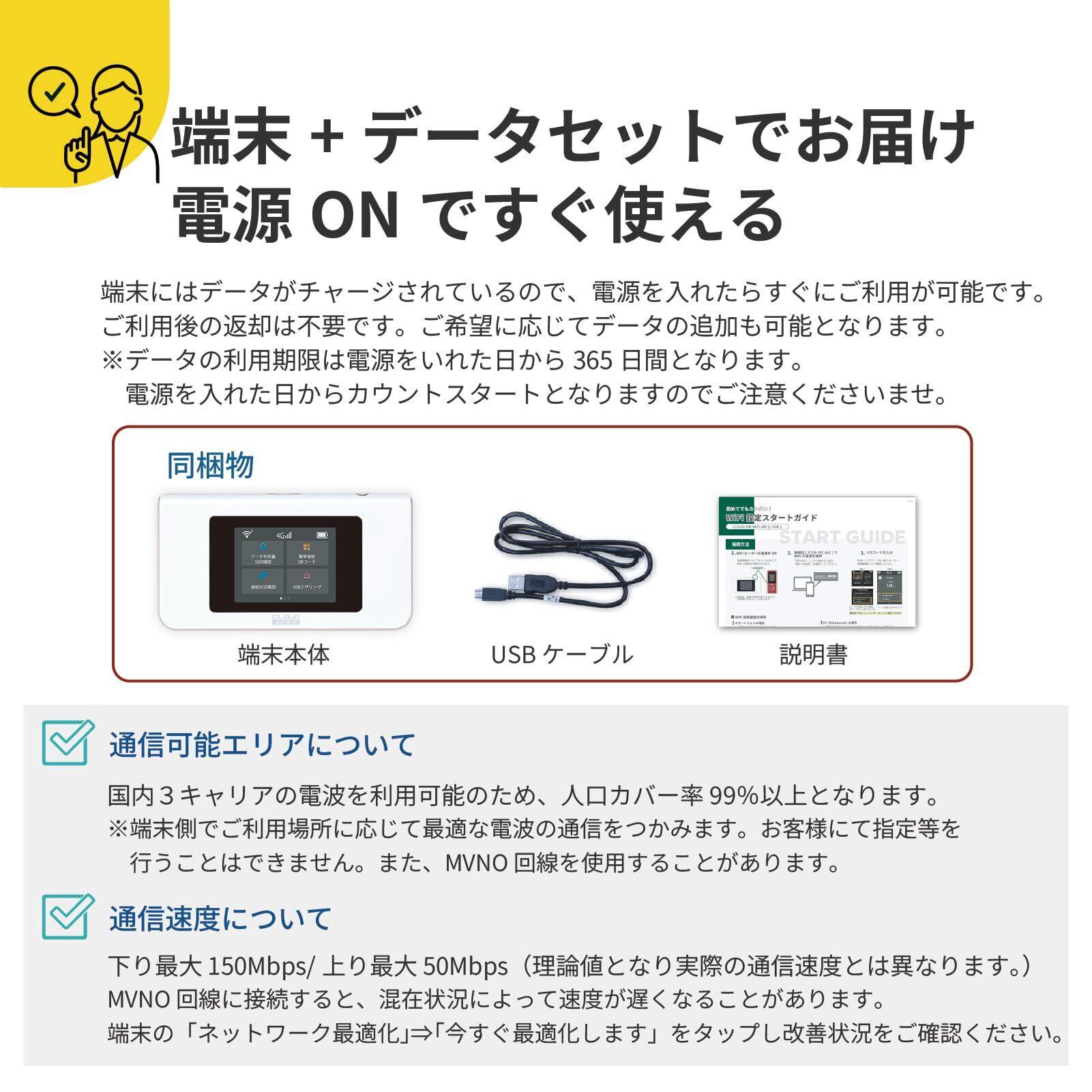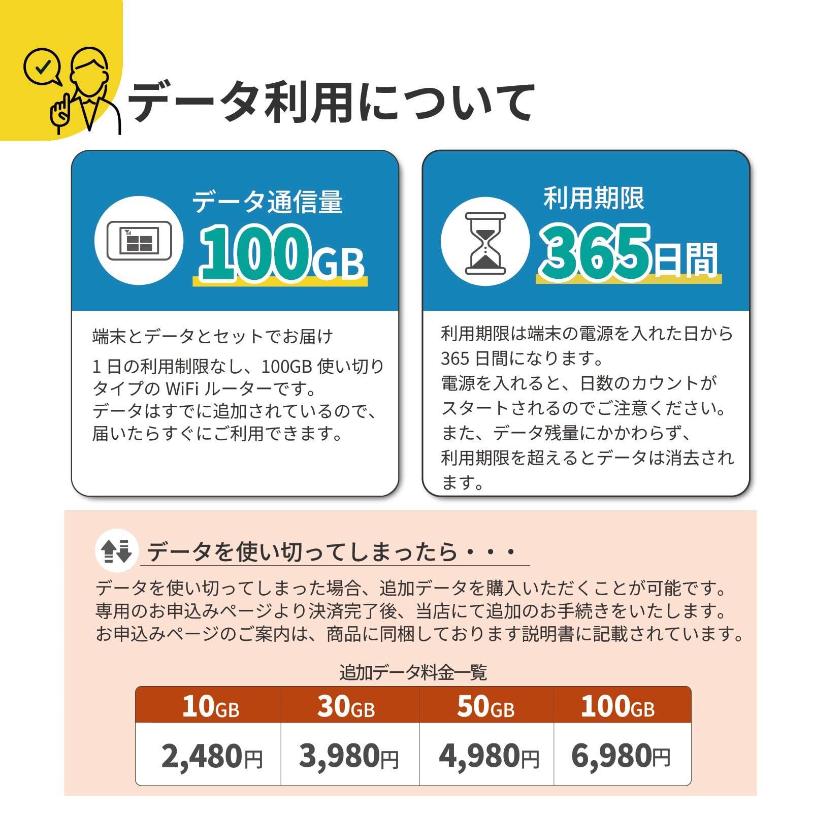 【端末+データのセットでお届け】100GB・365日間ご利用可能。利用期限のカウントは商品到着後電源を入れた日からとなります。データを使い切った場合、追加でご購入が可能です。データ追加専用サイトより10GB~購入可能、購入方法は商品に同梱しておりますスタートガイドにてご確認ください。(追加サイトのURLを記載しております)