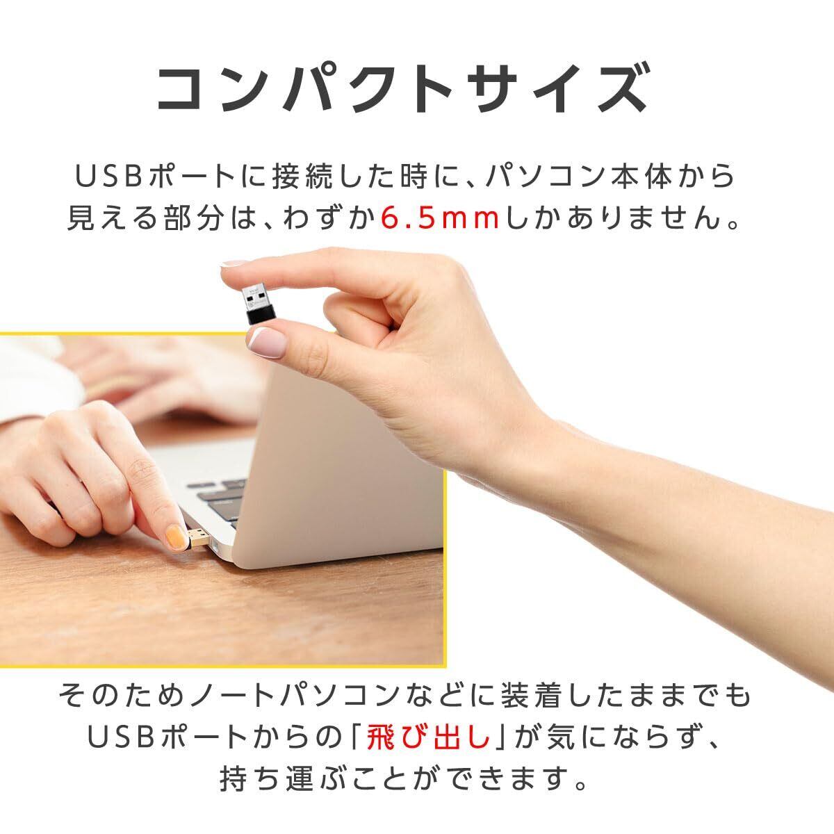 コンパクトサイズ ノートパソコンなどに装着したままでもUSBポートからの「飛び出し」が気にならず、持ち運ぶことができます。