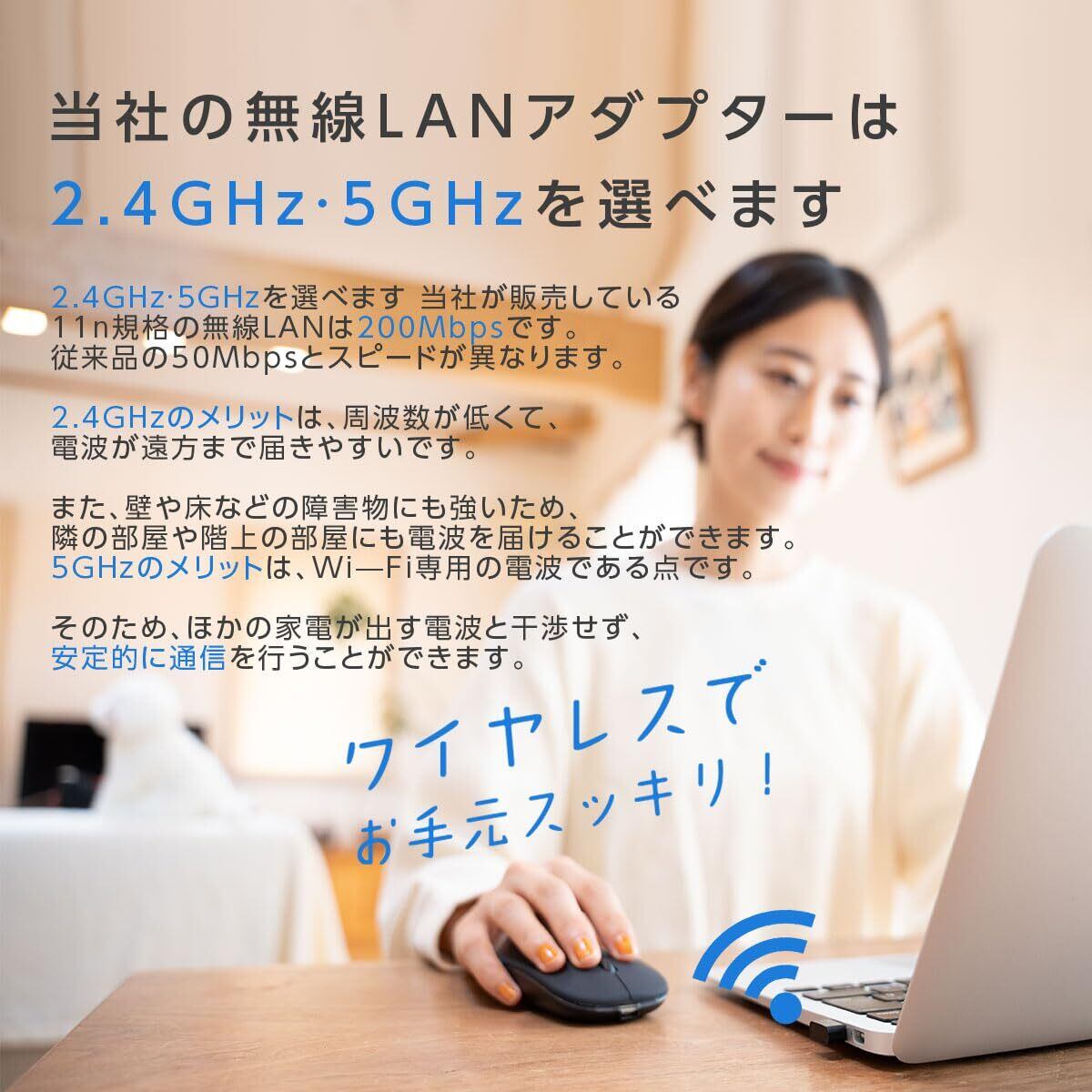 2.4GHzと5GHz対応できます。 2.4GHzは、電波が遠方まで届きやすく、壁や床などの障害物にも強いです。 5GHzは、他の家電が出す電波と干渉軽減、安定的に通信を行うことができます。