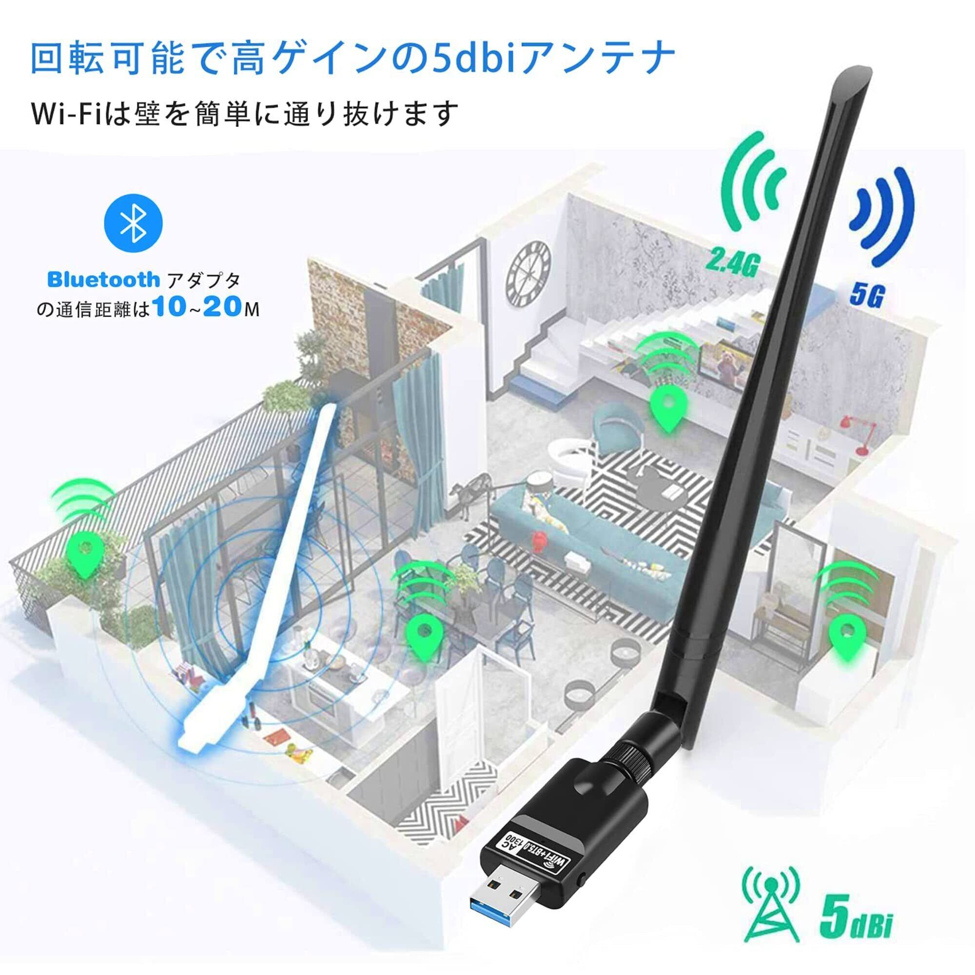 【2in1 最新バージョン】USB3.0 WiFiアダプタ +Bluetooth5.0 2in1 デュアルバンド 1300Mbps WIFI 無線LAN子機 5dBiアンテナ 5G/2.4G対応 802.11a/b/g/n/ac 無線規格 Windows11/10 高速通信 オンライン授業/テレワーク対応