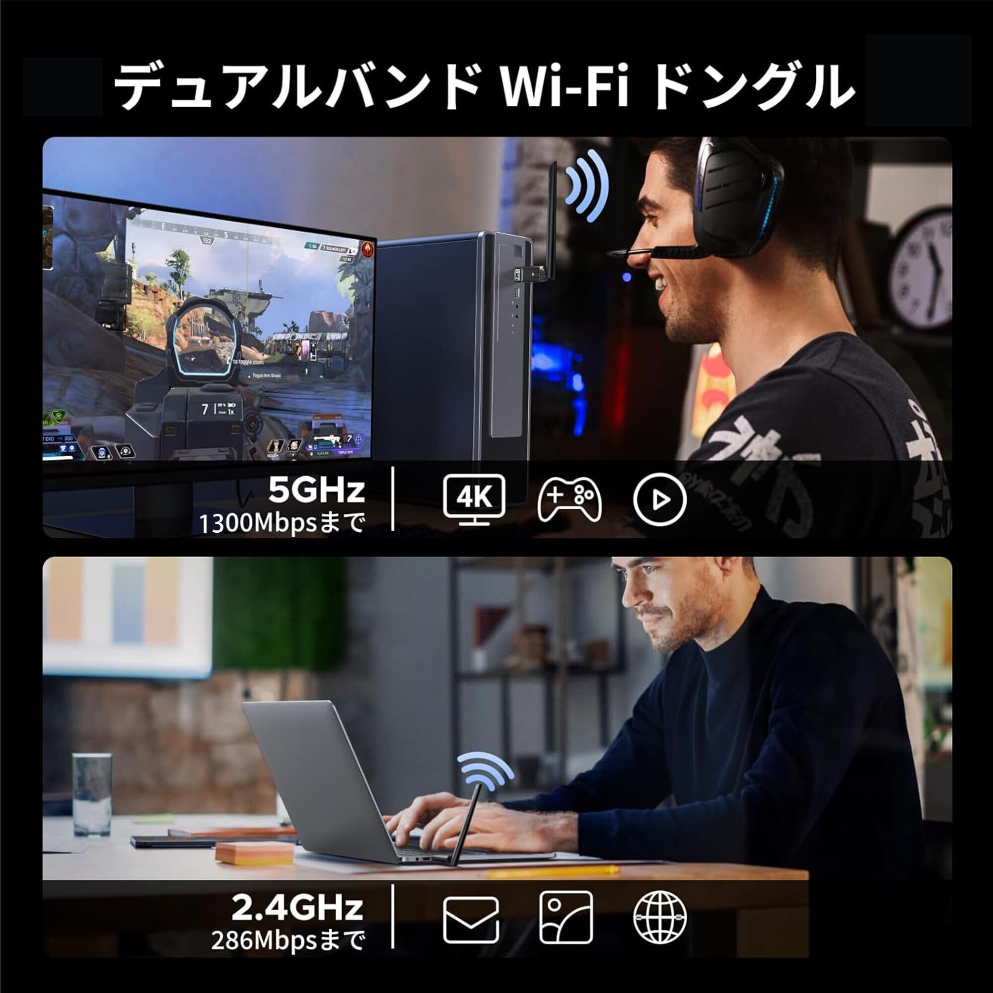 【5dBiアンテナ・広範囲】無線LAN子機は最大5GHz帯(867Mbps)+2.4 GHz帯(300Mbps)の超高速接続、最高1300Mbpsで通信可能になります。信号がより安定、高速で、障碍物が多い環境においても、安定したWi-Fi通信ができます。可回転5dBi高増幅アンテナを搭載、安定した送受信を行うことができ,部屋を離れでも壁などの障害を越えます。注: wifi6 のアップグレードはサポートしていません
