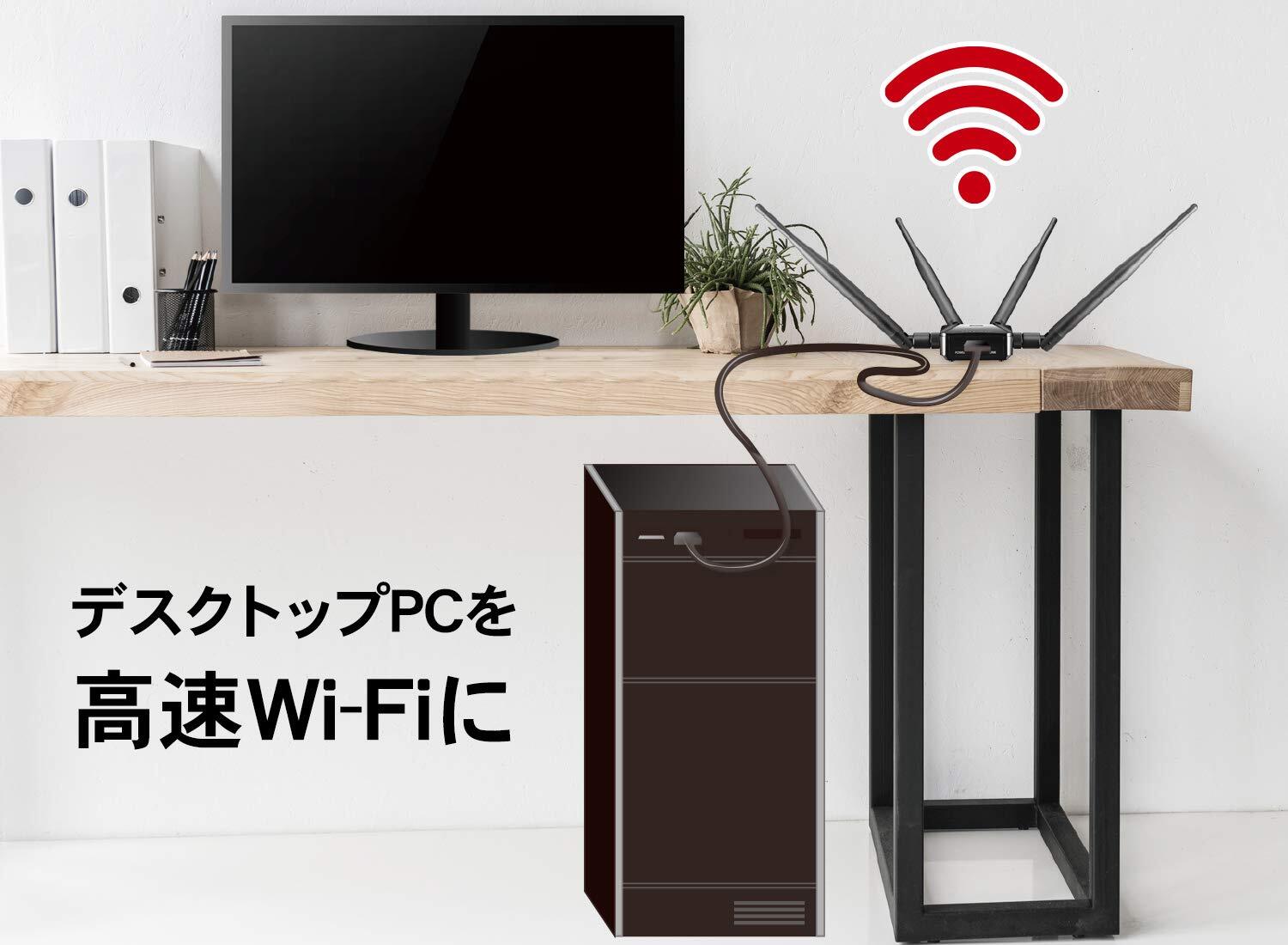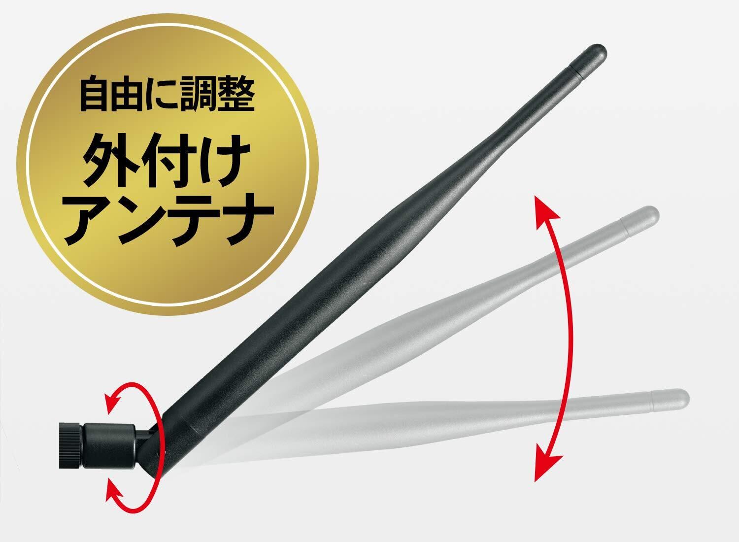 ■11acに対応し最大1300Mbps(規格値)の高速インターネット通信に対応したUSB接続のWi-Fi子機です。 ■Wi-Fi接続でありながら、有線LAN接続に近い高速通信が可能です。 ■高品質な動画やストリーミング配信をWi-Fi接続で見たいという方や、パソコン内蔵のWi-Fi機能では速度に満足できないという方に最適です。 ■USBバスパワーで動作し電源ケーブルが不要のため、パソコンにUSBケーブル1本接続するだけでネット環境を簡単にアップグレードできます。 ■4基あるアンテナは、個別に自由な角度に動かす事が可能なため、Wi-Fiルーターの設置場所に合わせて最適な角度となるように調整いただけます。