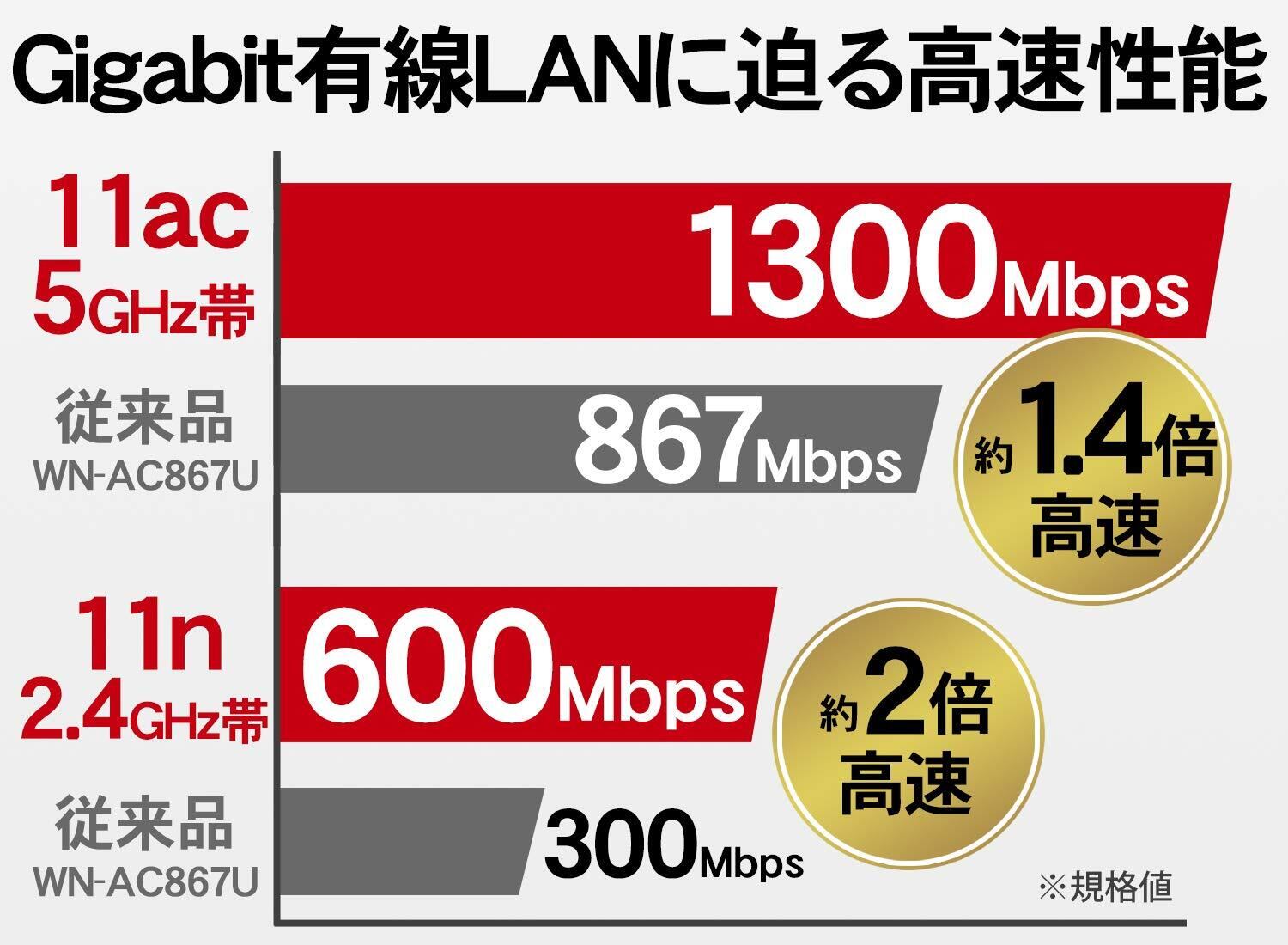 [特長]11ac 高速1300Mbps対応 Wi-Fi子機 [スピード] 1300Mbps(11ac)、450Mbps(11n):256QAM対応機器通信時最大600Mbps