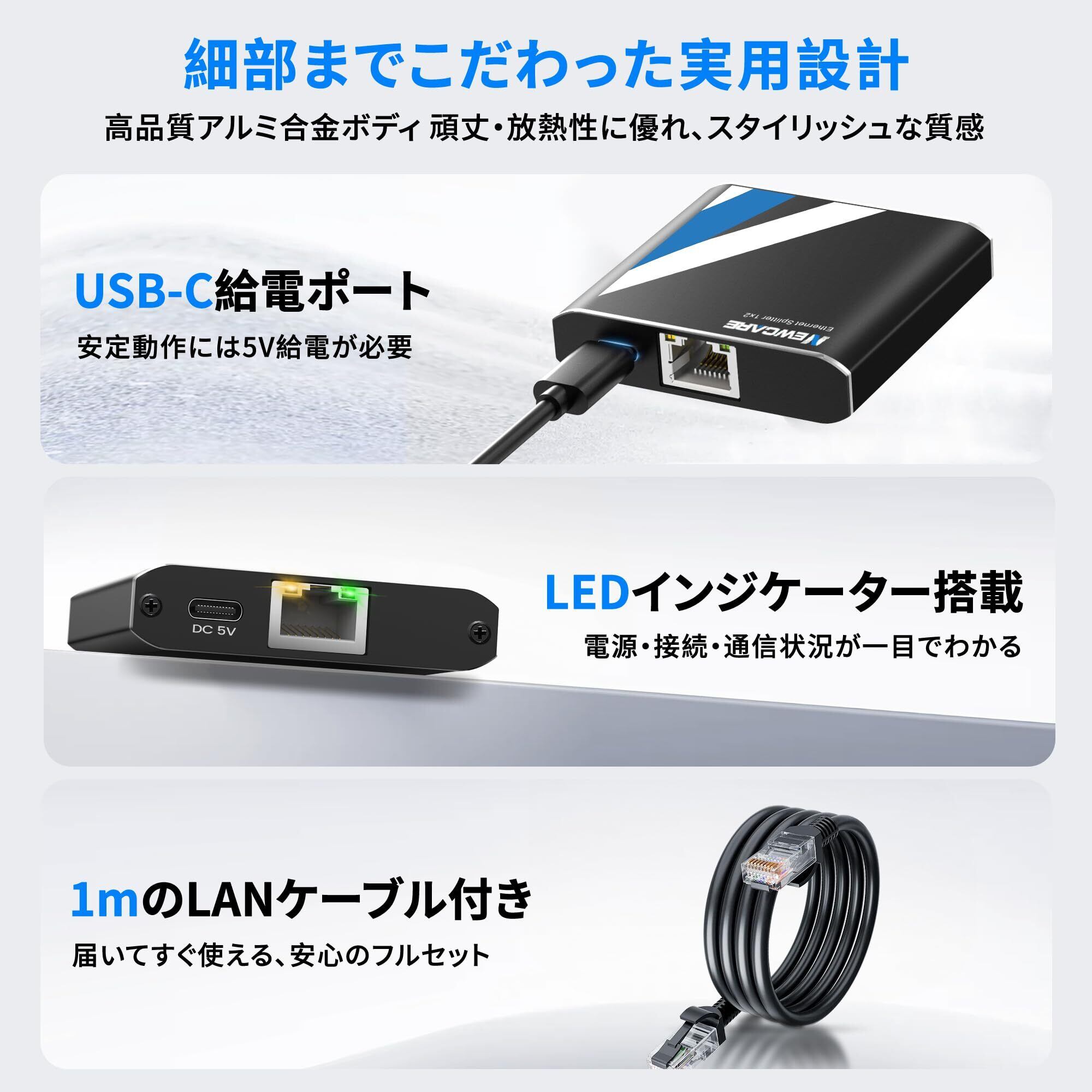 【1000Mbps ギガビット高速伝送】アップグレードチップ採用で最大 1000Mbps(1Gbps)の伝送速度を実現。最大約100mの長距離伝送をサポートします。ストリーミング、オンライン会議、大容量ファイルの送受信など、高速・安定通信を必要とするシーンでも活躍。Wi-Fi環境よりも安定した通信を確保します。(※1000Mbpsでご利用の場合はCat6以上のLANケーブルを推奨)