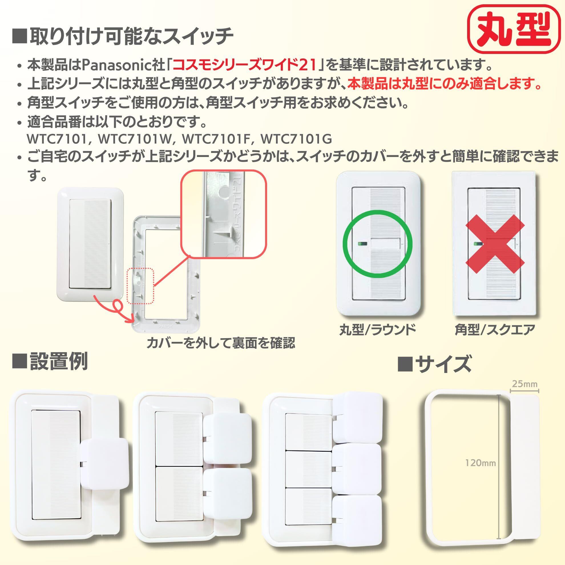 適合するスイッチプレート:Panasonic「コスモシリーズワイド21」の【スイッチが縦一列に並んでいる丸型スイッチプレート】に適合します。角型プレートや、2列以上のスイッチプレートには適合しませんのでご注意ください。