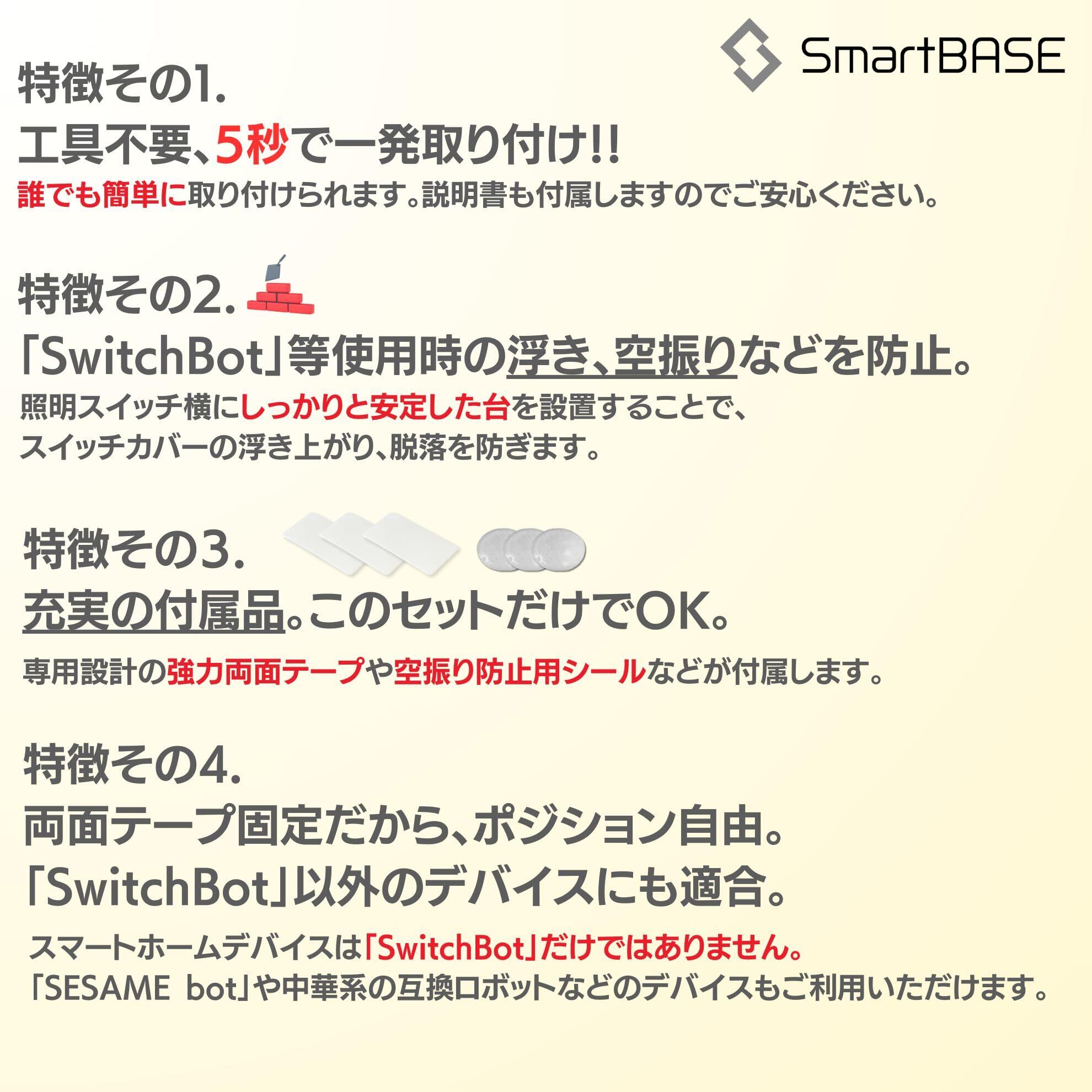 工具不要、はめ込むだけ!5秒で設置できるスマートホームデバイス用マウントができました。スマートデバイスの動作が不安定でお悩みではありませんか?SmartBASEを使えば、SwitchbotやSESAME botなどのスイッチを押す指ロボットの動作を劇的に安定化できます!