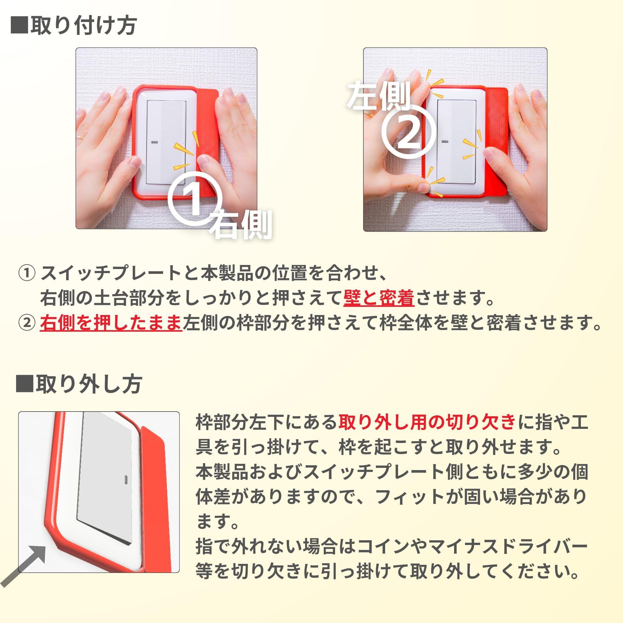 独自設計の構造【実用新案登録済】でカバーの浮きや脱落をしっかり防止。取り付けは非常に簡単3ステップ。①当商品を壁のスイッチに合わせて、②当商品の右側部分を壁にグッと強く押し付けながら、③左側を「パチッ」とハマるまで押し込むだけ!あまりにも簡単なので、ぜひ商品紹介動画を見てご確認ください。