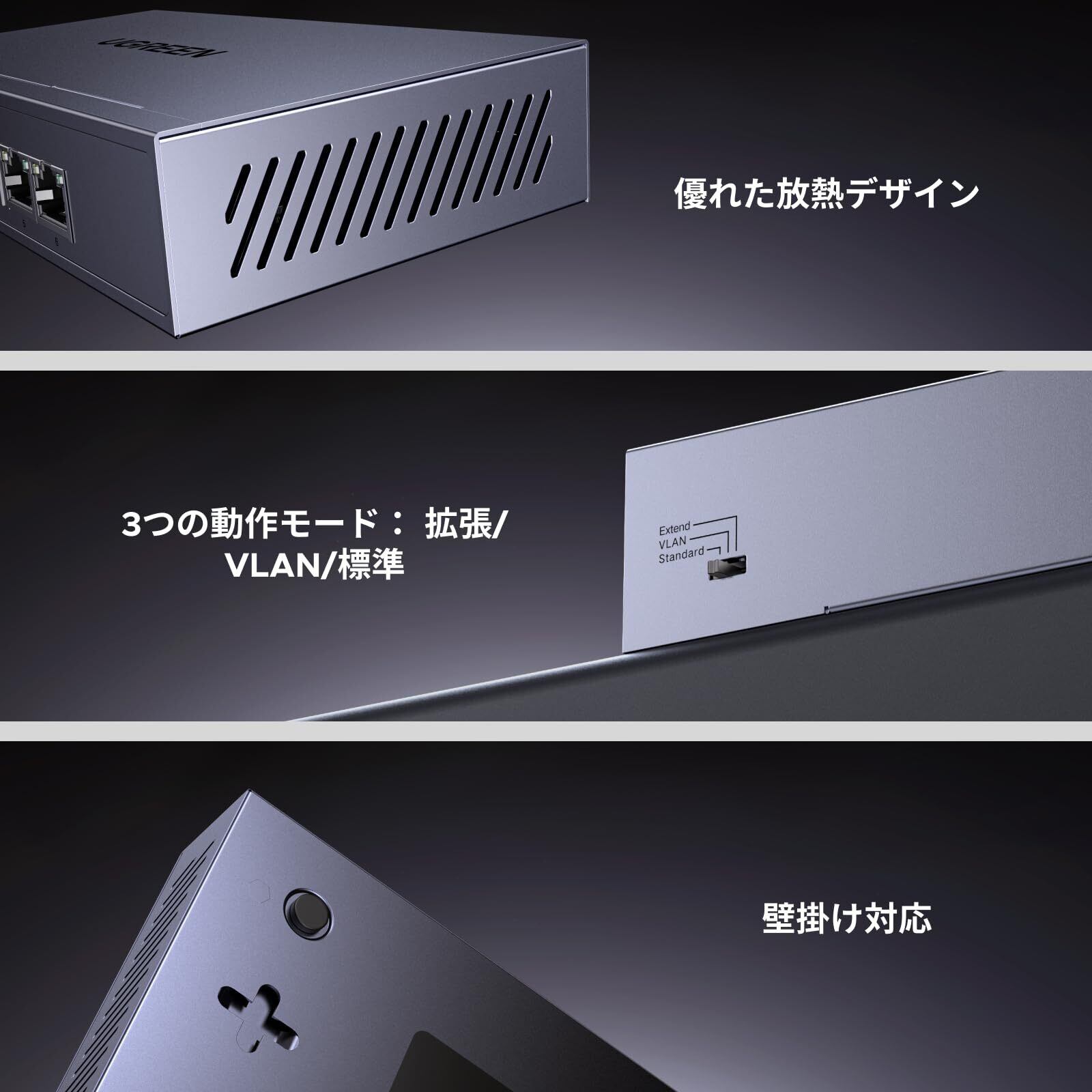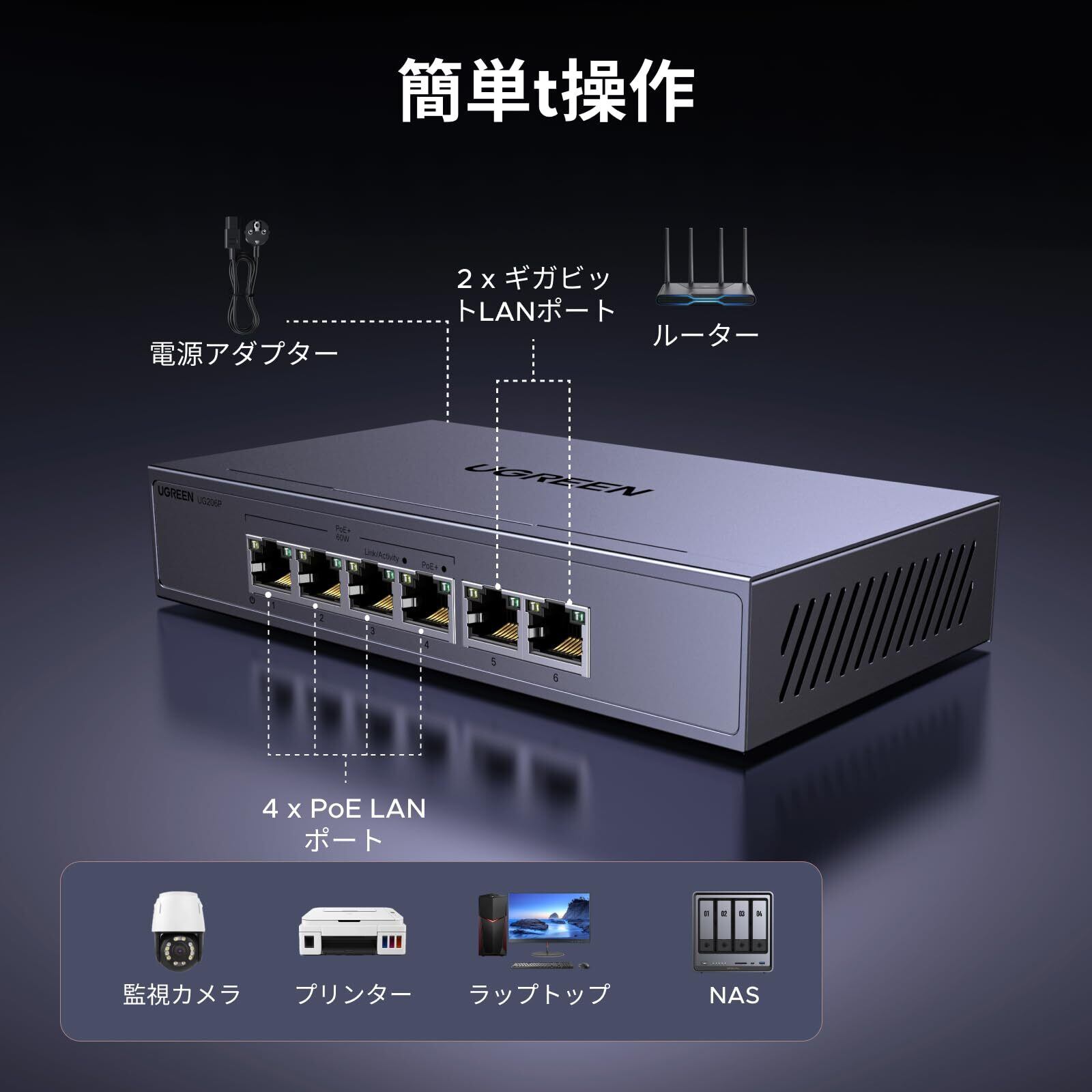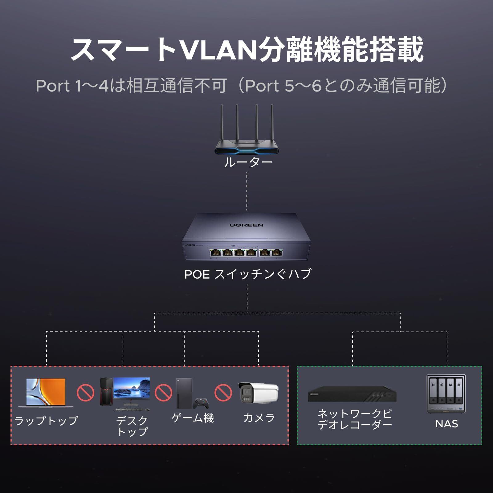 UGREEN スイッチングハブ 6ポート PoE Giga対応(4×PoE+2ポートギガビット) 全ポート60W 10/100/1000Mbps ギガビット 壁掛け対応 プラグ&プレイ 金属筐体 PSE認証取得