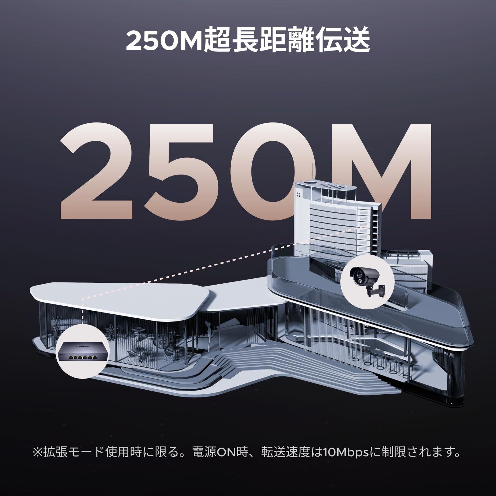 【ただワンタッチ・三つのモード】このスイッチは、標準・VLAN・拡張の3モードを簡単に切り替えられます。VLANモードでは、ポート1〜4が相互に隔離され、ポート5〜6とのみ通信可能で、ネットワーク管理性の向上とネットワークストームの防止に役立ちます。PoEの伝送距離が最大250m*に—広範囲にわたる監視カメラの設置が可能になります。