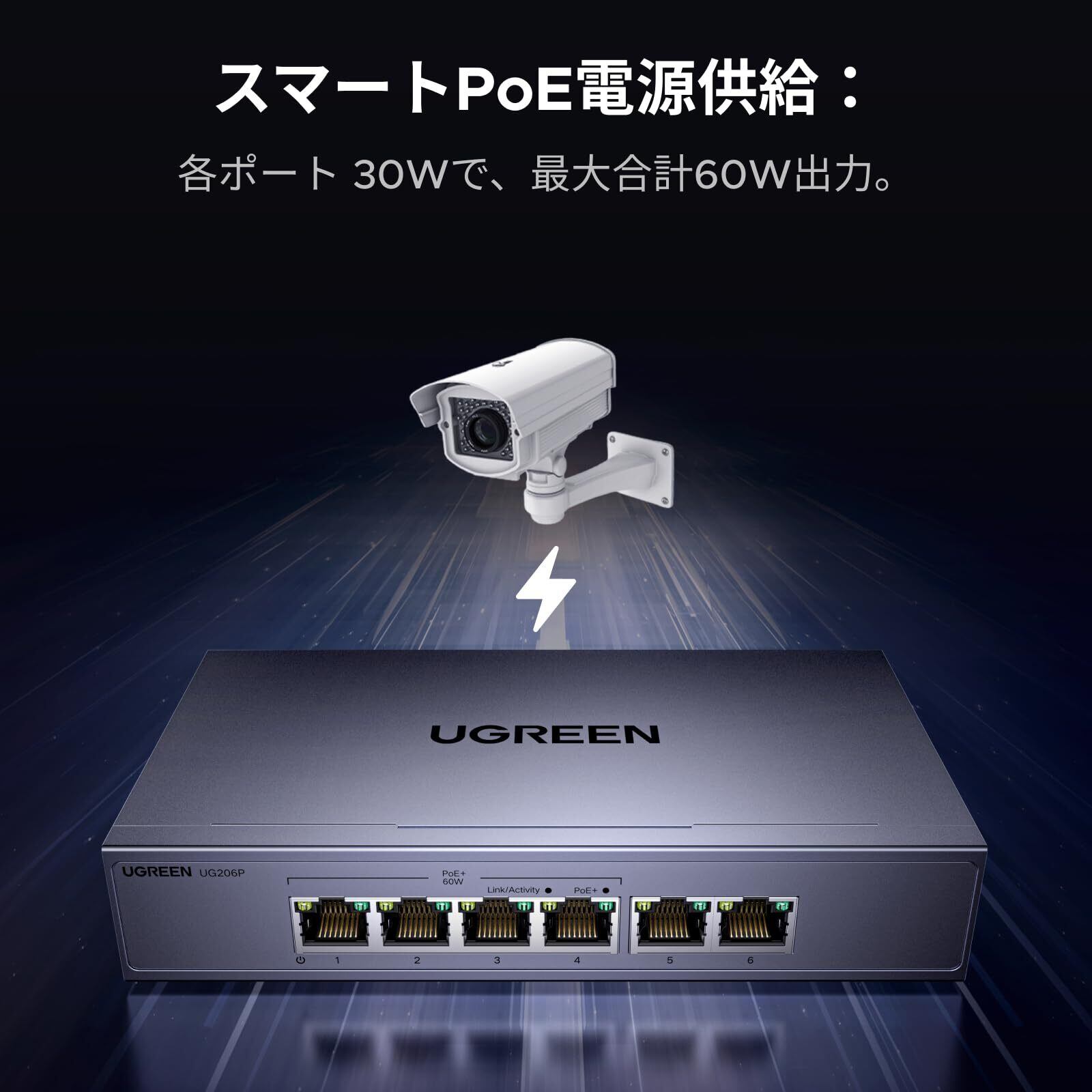 【ギガビット環境を手軽に構築】UGREENの6ポートPoEスイッチは、4つのPoE+ポート(IEEE 802.3at/af対応)を備え、各ポート最大30W、合計最大60Wまでの給電が可能です。また、2つのギガビットLANポートを搭載しています。