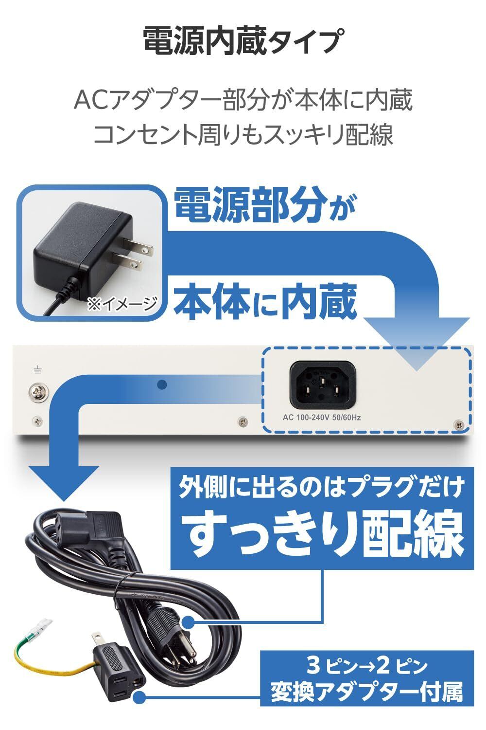 ■付属の専用ACケーブル及び付属の変換アダプターに耐トラッキング性のコンセントプラグを採用。長期間設置した場合でも、トラッキング現象を防止します。