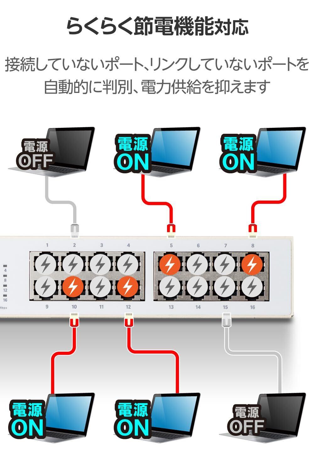 ■らくらく節電機能により、接続していないポートや、リンクしていないポートを自動的に判別し、電力供給を抑えます。パソコンがシャットダウンしている環境では、大幅な電力の節約を実現することができる、省エネ法に準拠したスイッチングハブです。