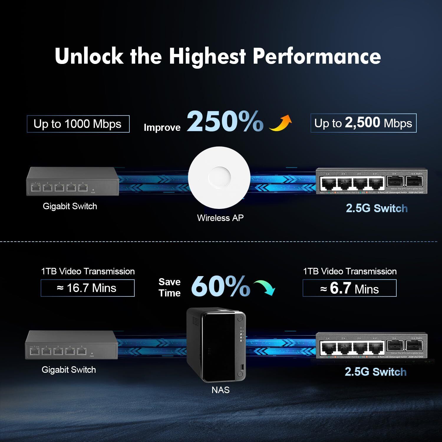 【2.5Gポート】4 x 2.5ギガビットイーサネットポート、100Mbps/1Gbpsに対応。 2x10G SFP+スロット、1G/2.5G/10G光学モジュールと互換性があります (モジュールはデフォルトでは含まれていません)。 60Gのスイッチング容量。