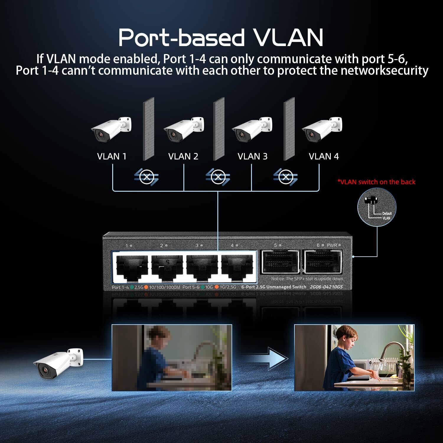 【ポートVLANをサポート】ディップスイッチを介してポートVLAN機能をサポートし、開封後、ポート1-4は互いに分離され、アップリンクされたポート5とのみ通信し、ブロードキャストストームを減らし、ネットワークセキュリティを向上させます。
