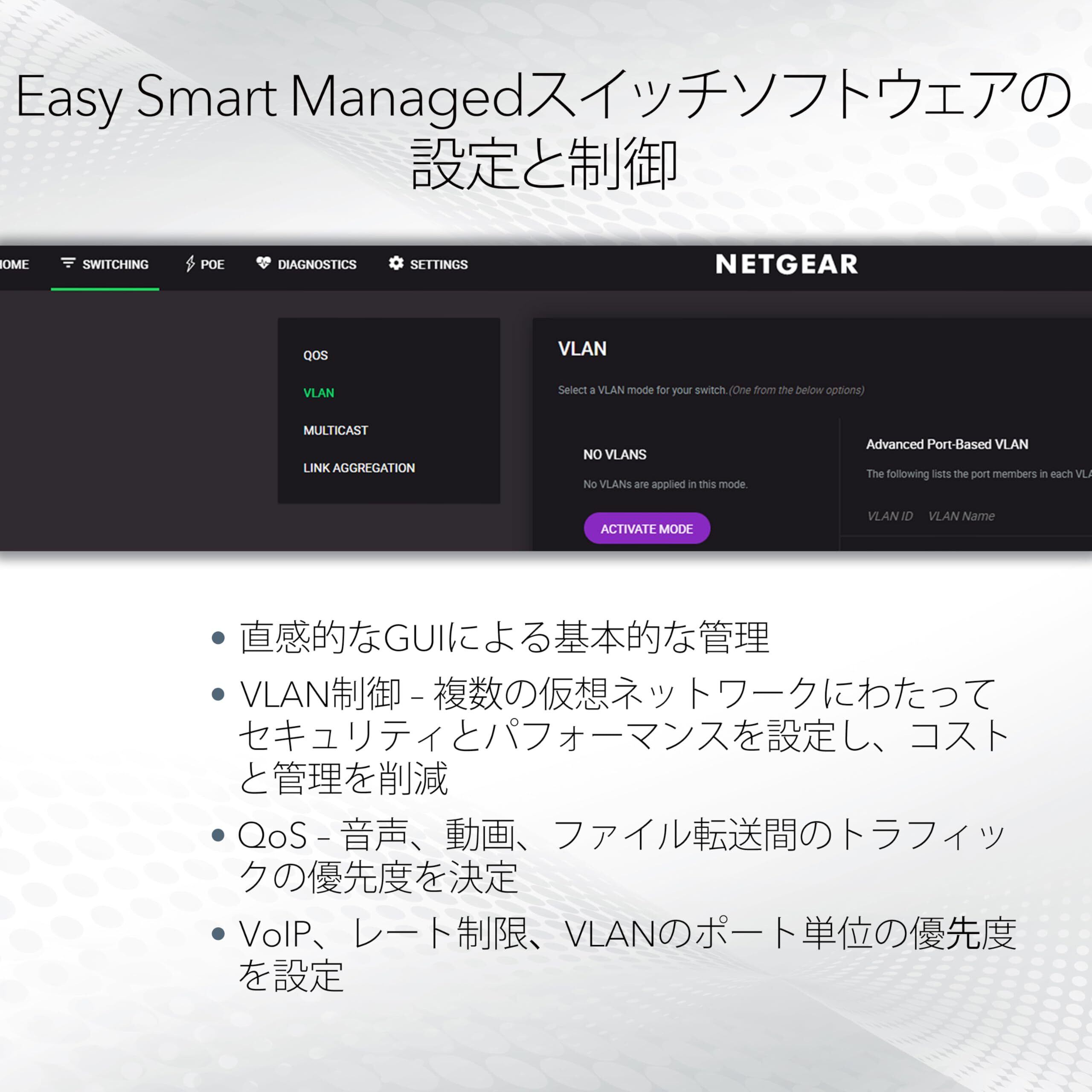 VLAN(ポート、タグ)、QoS(802.1p, DSCP, ポート)、マルチキャスト(IGMPスヌーピングv1/2/3)。サイズ9,000バイトのジャンボフレームに対応し、データ転送が効率的に行える。