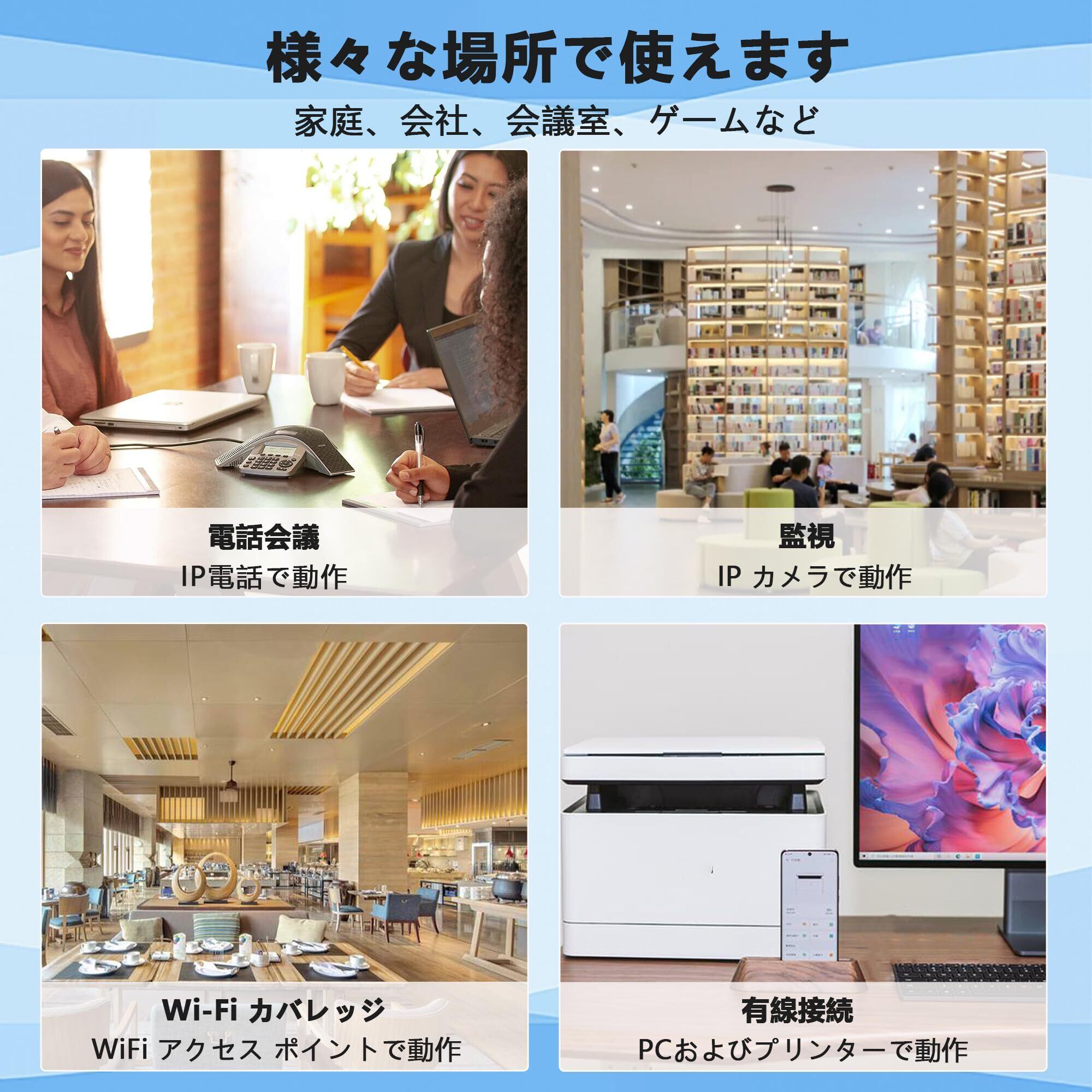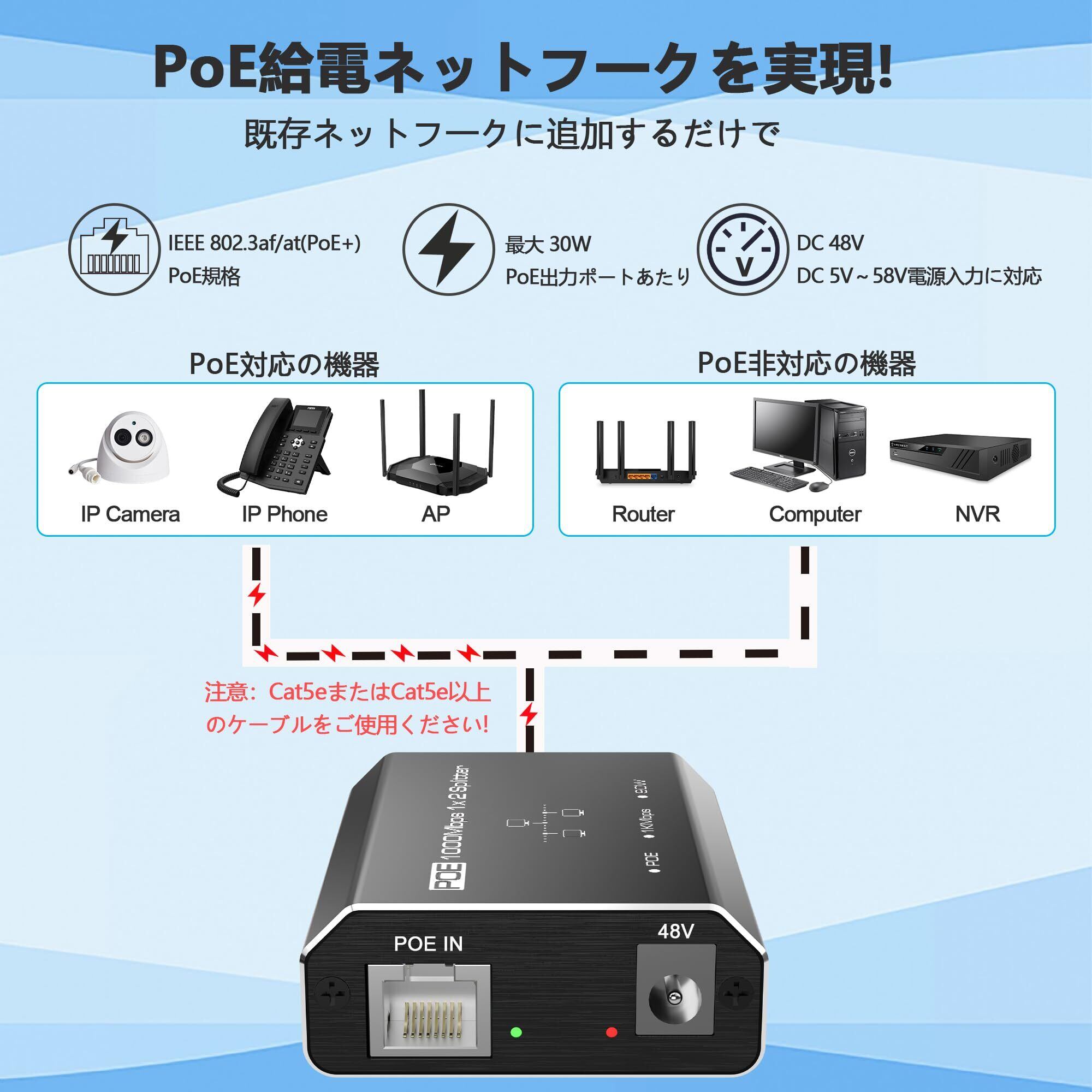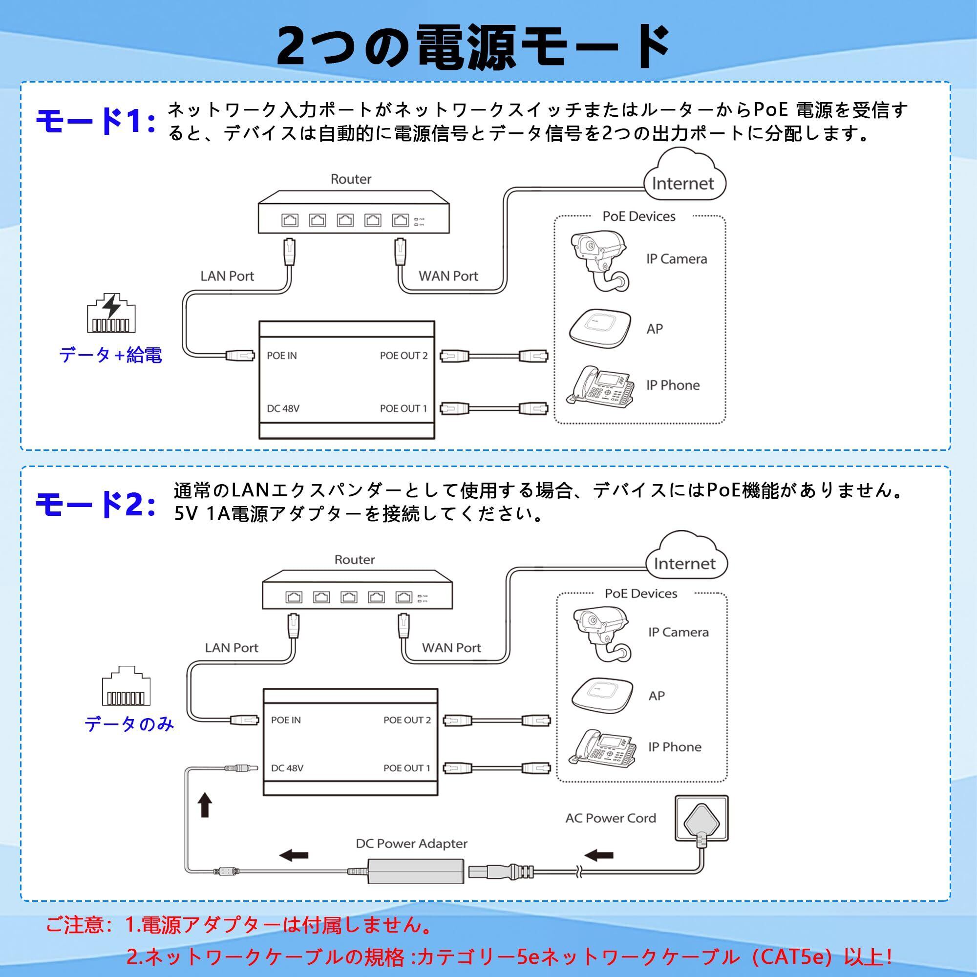 【IEEE802.3AF/AT標準】このPOE ハブは、すべての標準IEEE802.3af / at POEスイッチ、POEインジェクター、POE NVRで動作できます。POE出力は、POE IPカメラ、IP電話、ワイヤレスAP、IPスピーカーなどの標準POEデバイスに電力を供給します。規格上は100mまで給電できます。LANの規格であるイーサネットの最長伝送距離が100mだからです。【重要な注意】1.通常のLANエクスパンダーとして使用する場合、デバイスにはPOE機能がありません。5V 1A電源アダプターを接続してください。2. POEスイッチを接続し、電源は必要ありません。3. 通常のLANスイッチを接続します。プラグインDC 48V 1A電源アダプター。【パッケージ内容】1xPOE ハブ、1x日本語取扱説明書。