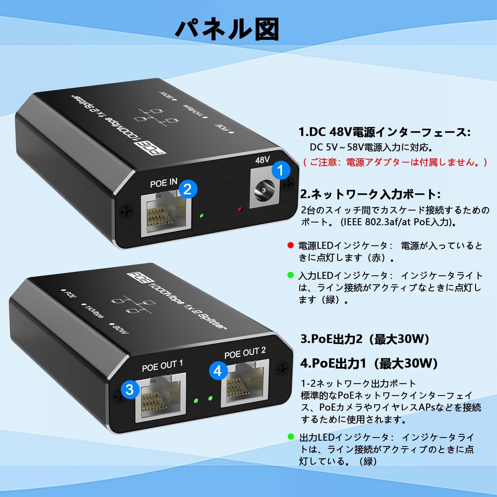 【POE対応ハブ 1入力2出力】POE ハブ 1入力2出力は、データ通信と電力供給を同時に行う複数のポートを持つデバイスです。これにより、ネットワークカメラや無線LANアクセスポイントなどのPOE対応機器を接続し、データ接続と電力を一つのEthernetケーブルで供給できます。POEネットワーク入力がない場合、デバイスは外部電源アダプタをサポートし、接続されたデバイスに電力を供給し、非POEをPOEに変換します(ご注意: 電源アダプターは付属しません)。