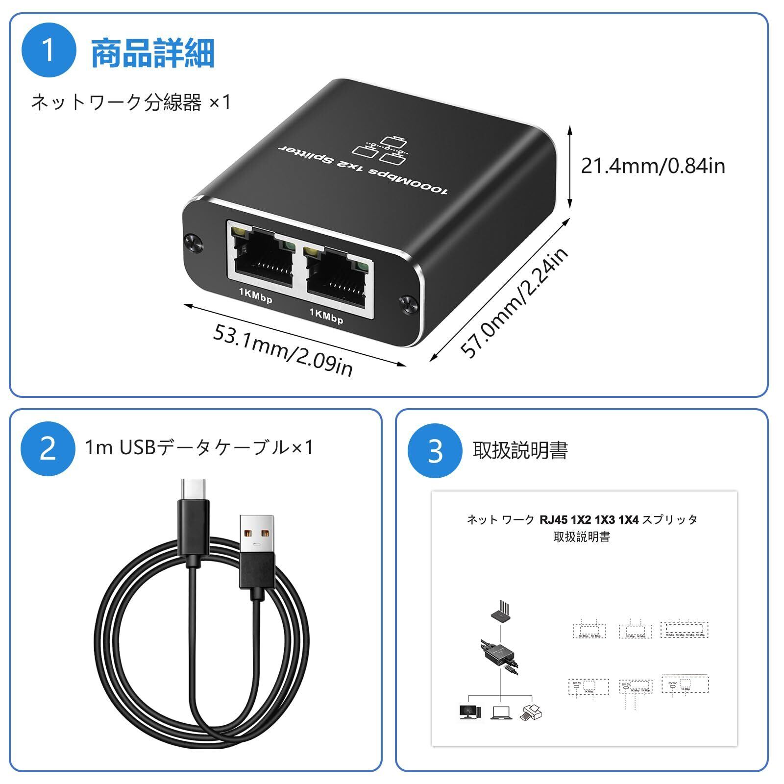 【アフターサービス】このネットワークスプリッターのパッケージには、ネットワークスプリッター、USBケーブル、日本語マニュアルが含まれています、何か問題があるネットワークスプリッターを受信した場合は、電子メールでいつでも私達に連絡することができます、私たちは12時間以内に返信されます