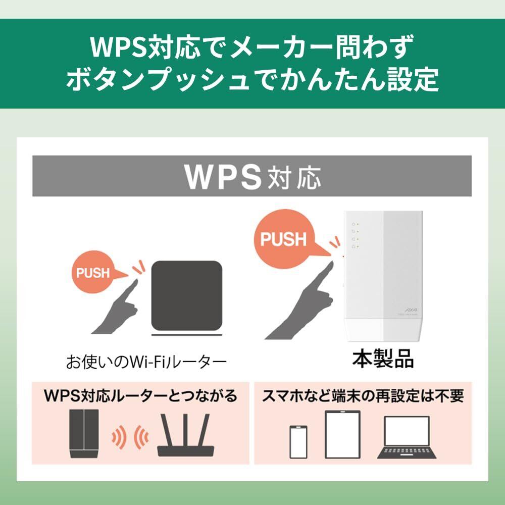 【Wi-Fiルーターとの引き継ぎ設定は"ワンタッチ】WPSボタンをプッシュして設定完了できるので、スマホなどのWi-Fi対応機器の設定変更必要なし。
