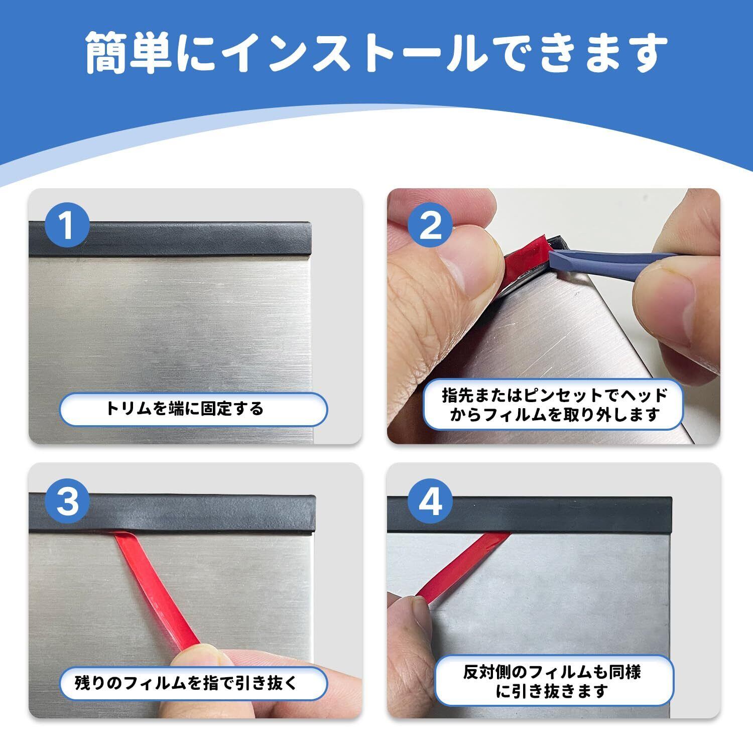 【自己粘着エッジトリム】このUチャンネルエッジトリムは、自己粘着トリムであるため、接着剤なしで直接取り付けることができます。 エッジトリムの接着剤は簡単に取り外すことができ、製品を腐食させず、エッジトリムを取り外した後に製品に跡が残りません。