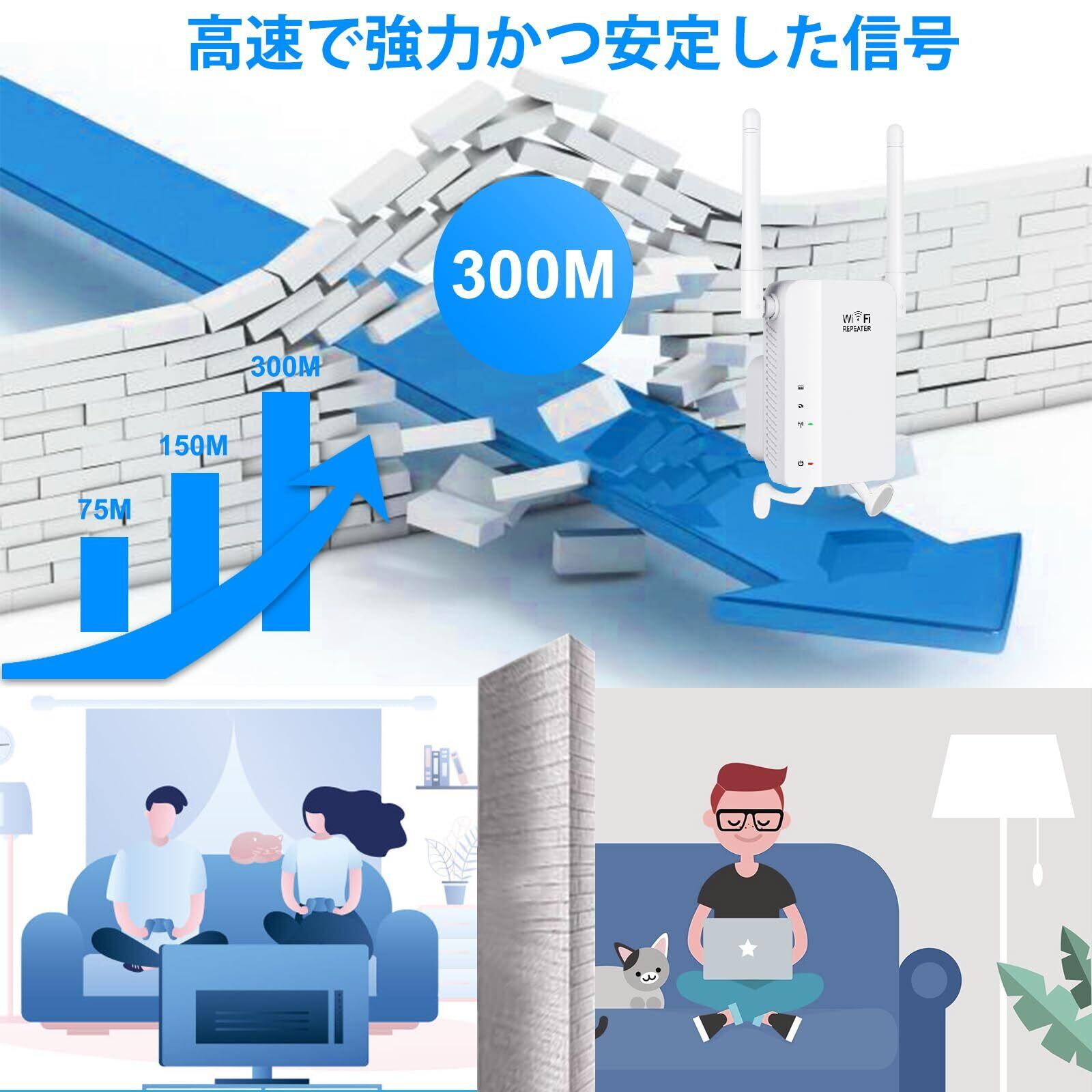 【高利得デュアルアンテナ】WiFi 無線LAN中継器には2つの高ゲインアンテナが装備されており、WiFi信号が壁を通過する能力が大幅に向上します。WiFi信号が家全体を360度カバーできるように、WiFiネットワークをさらに離れた場所に拡張します。親機信号が家の隅に届かないという問題を解決しました。家中どこでも快適にWi-Fiを楽しめます。