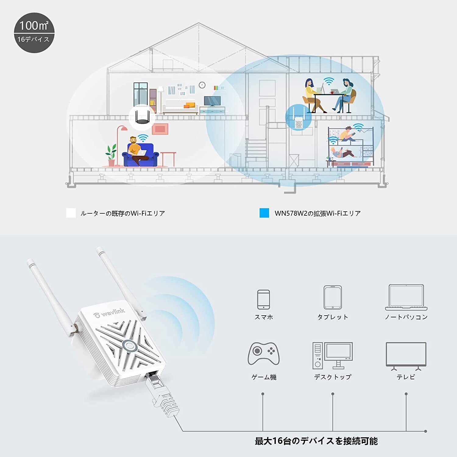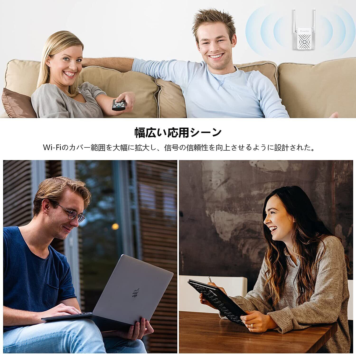 【安定したWi-Fi 中継機】Wi-Fi 中継機には2つの180°調整できる外部アンテナが搭載されており、より安定した信号とより広いカバレッジを確保します。このWifi中継機を利用して、死角を排除し、既存のWi-Fiカバレッジを改善し、自宅やオフィスが以前はアクセスできなかった、または接続が困難な範囲に無線信号を拡張します。
