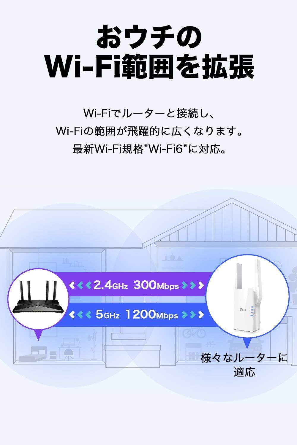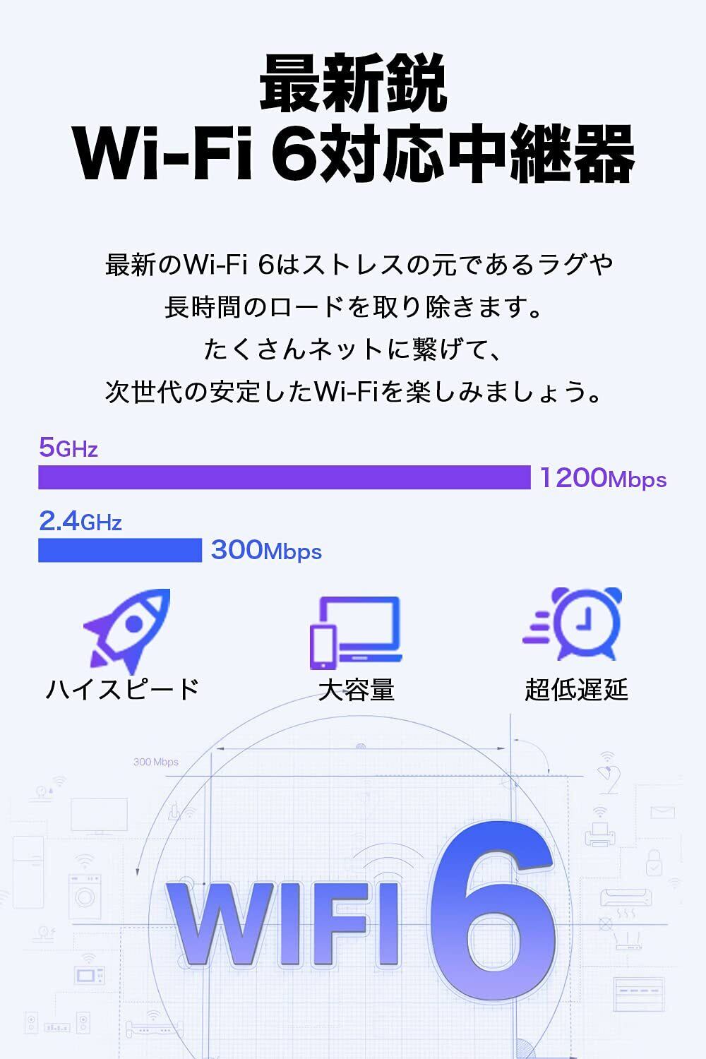 [特徴]: Wi-Fi6 規格値:1200Mbps + 300Mbps。Wi-Fiを中継し、繋がらなかった部屋にWi-Fiを届ける。