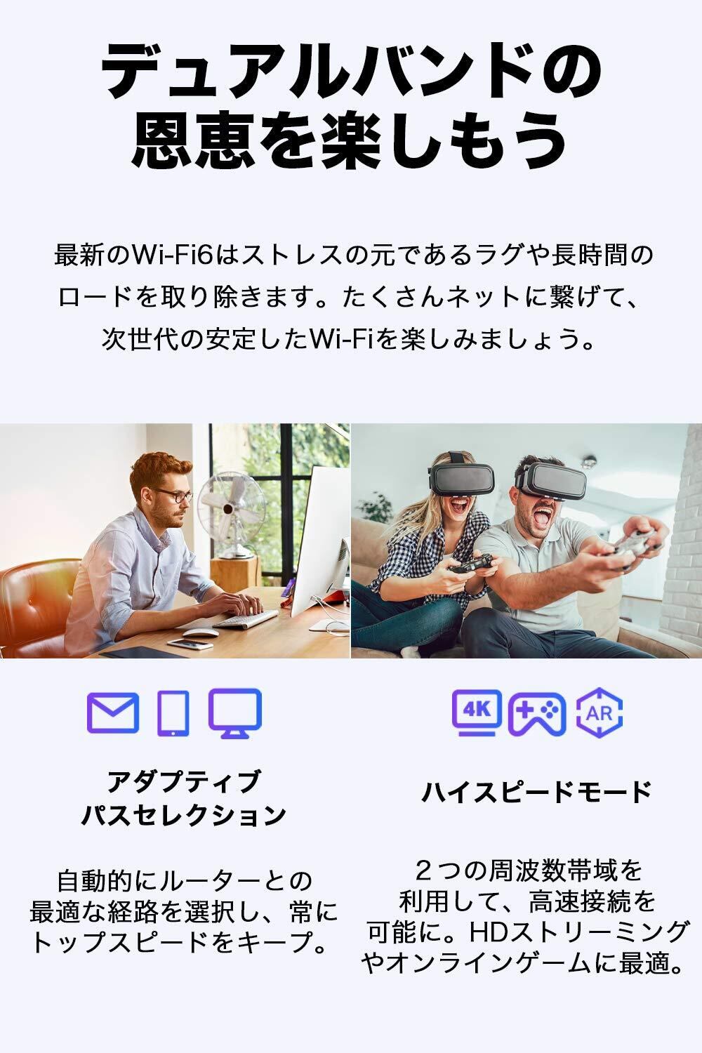 [WiFi6対応]:最新規格 "Wi-Fi6"。最新機能をフル搭載したWi-Fi6のスピードと安定性をより広い範囲で楽しもう。