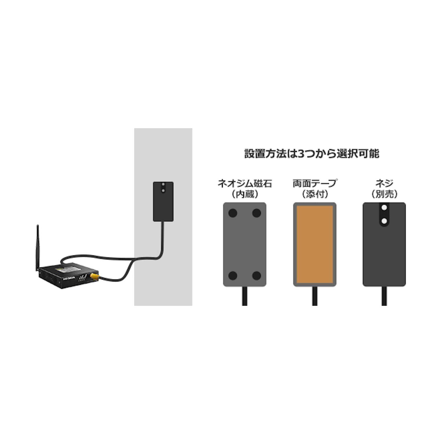 【3通りの固定方法】アンテナの固定方法は本体に取り付けられているマグネットによる取り付け、両面テープ、ネジ止め(※)の3通りから選ぶことができます。設置シーンに合わせてご利用ください。 ※アンテナを固定するネジは添付していません、M4ネジを別途ご用意ください。