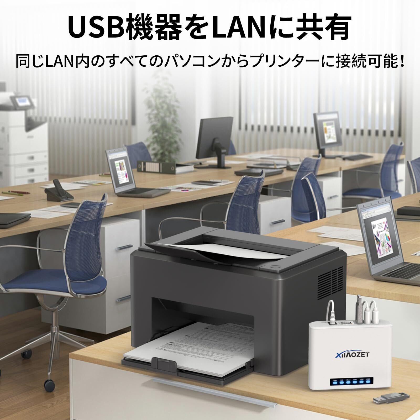 USBサーバー&プリントサーバー統合機能: 同一ネットワーク内の複数のPCから最大3台のUSBデバイス(プリンター・スキャナー・USBストレージ等)を共有可能。物理的な配線接続が不要になり、オフィス環境の配線を大幅に簡素化できます