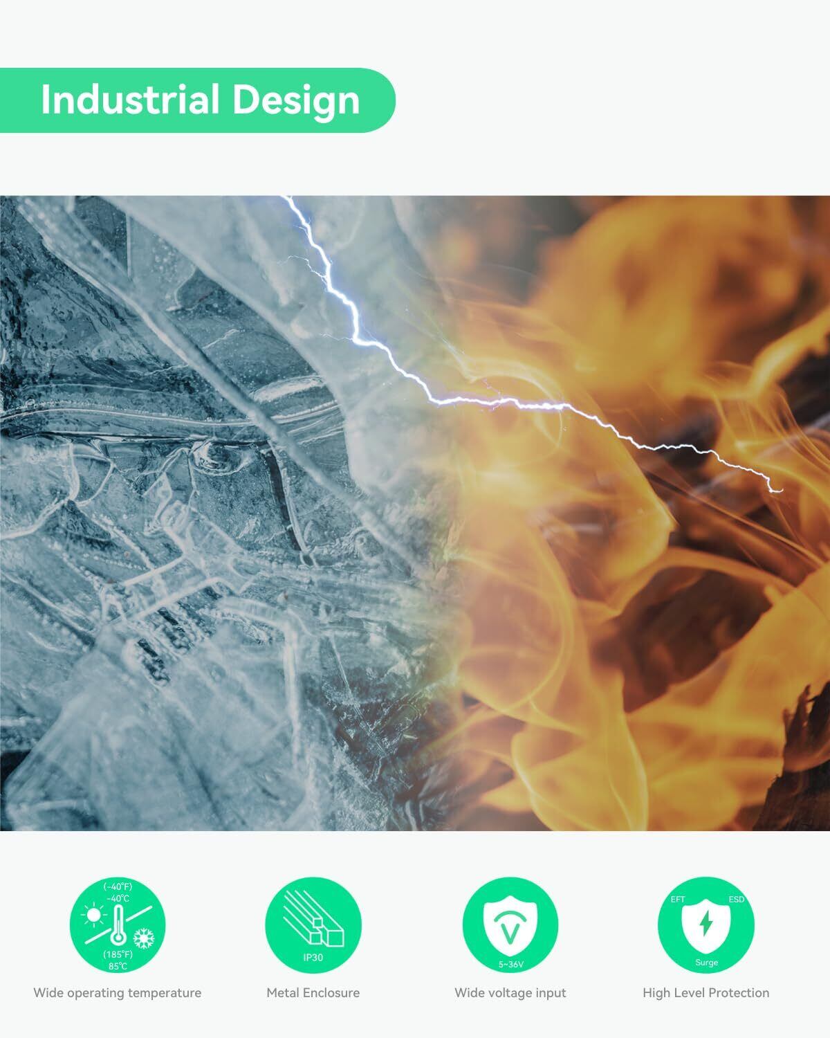 【工業級設計】壁掛け/レール取付可能、IP30保護、-40°F~185°Fの広動作温度範囲。