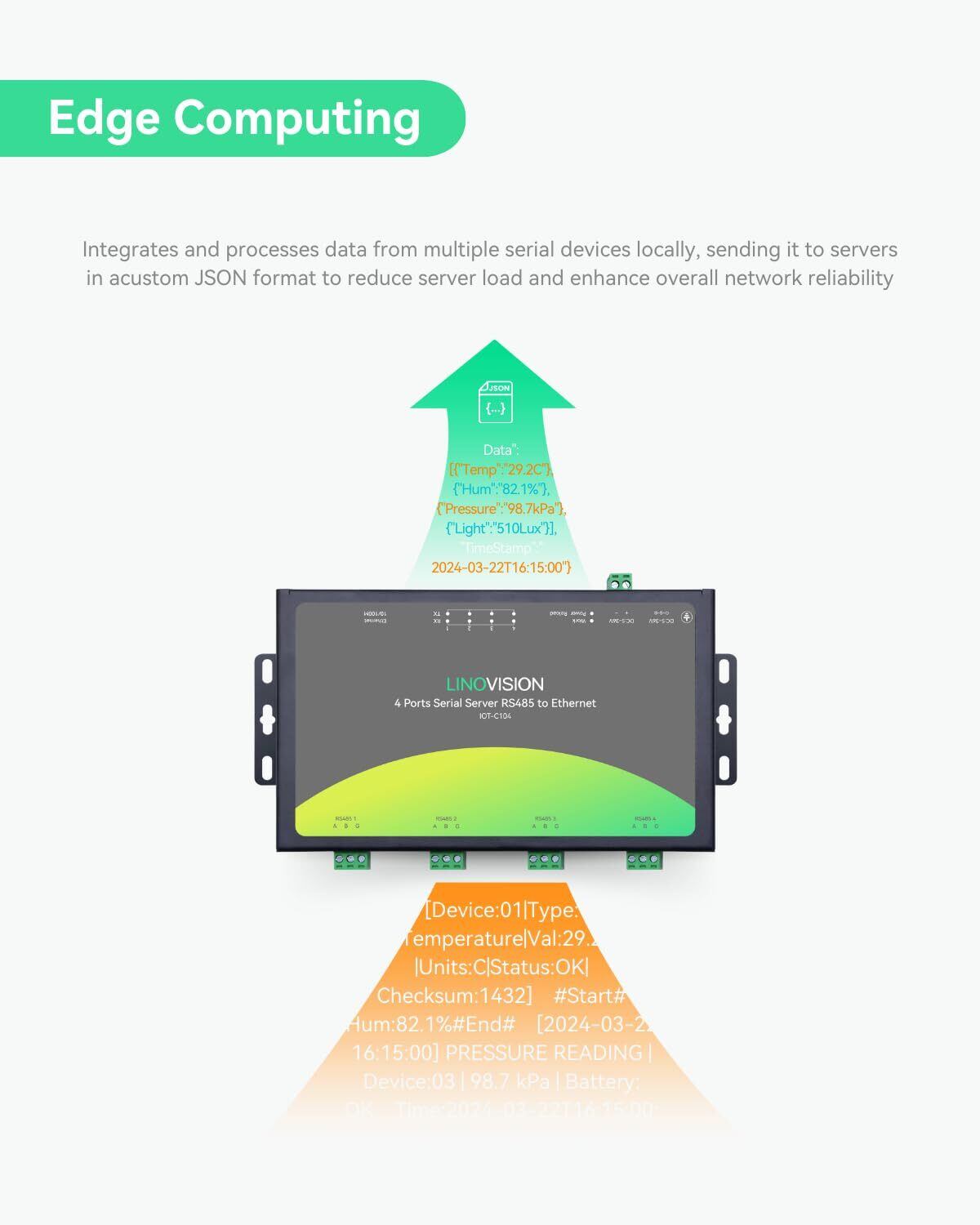 【エッジコンピューティング機能】 複数のシリアルデバイスからのデータをローカルで統合・処理し、カスタムJSON形式でサーバーに送信して負荷を軽減し、全体的なネットワークの信頼性を向上させます。