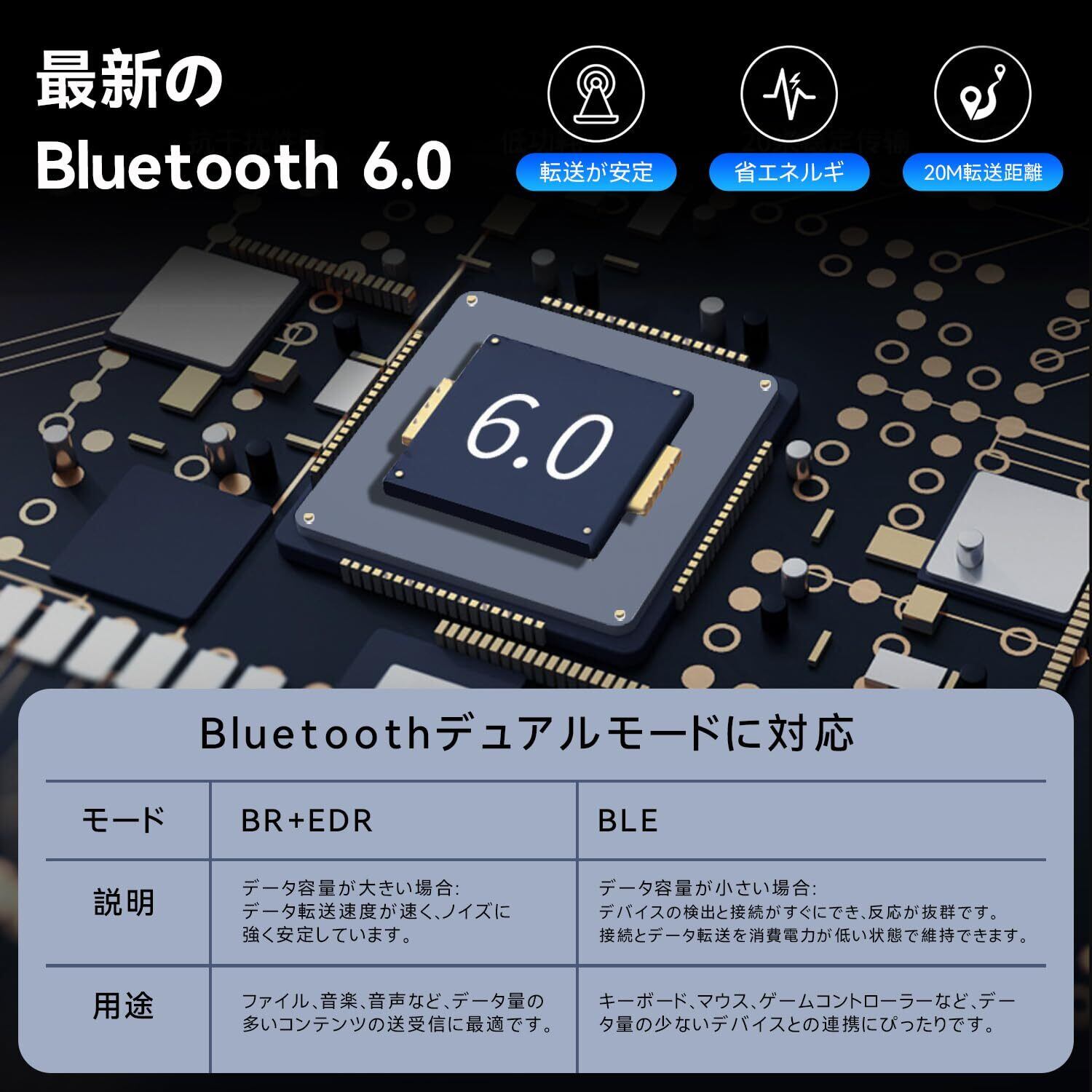 【EDR&BLEで省エネ安定稼働】 強化データレート(EDR)と低消費エネルギー(BLE)を統合。Bluetoothレシーバーとして長時間使用しても電力消費を最適化し、PC周辺機器の接続を安定的に維持します。