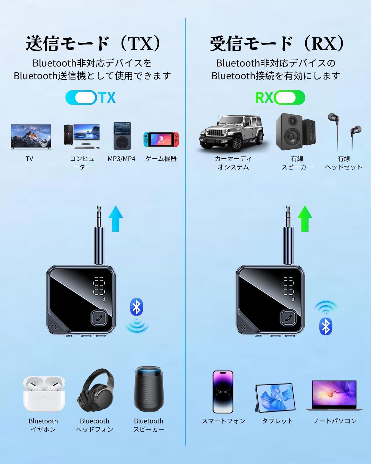 【2-in-1 Bluetooth送信機と受信機】本製品は、bluetooth トランスミッター(TXモード)とbluetooth レシーバー(RXモード)の機能を革新的に統合しています。スワイプするだけで簡単にモードを切り替えることができ、追加の機器なしで複数のデバイスのBluetooth拡張を実現できます。 TXモードでは、テレビ、コンピューター、Switch、MP3 / MP4などのBluetooth機能のないデバイスに完全に適応できるため、Bluetoothヘッドホンを接続して音楽を聴いたり、映画を見たり、ゲームを自由にプレイしたりできます。デバイスの内蔵オーディオ出力の制限を完全に取り除きます。 RXモードでは、カーオーディオや古いスピーカーなどのBluetooth非対応ステレオデバイスをBluetoothデバイスにアップグレードし、携帯電話、タブレット、ラップトップなどに簡単に接続して音楽を再生できます。 どちらのモードも、ケーブルの絡まりから解放され、移動中に安定したオーディオ再生を維持し、使い勝手を大幅に向上させます。