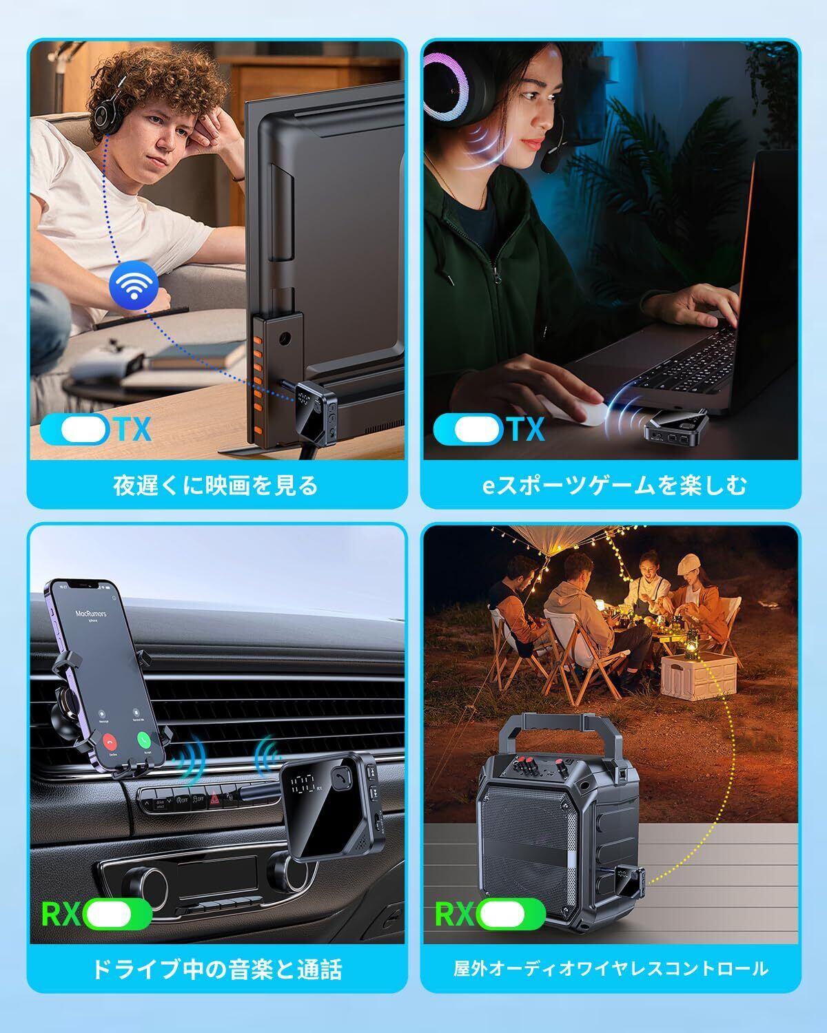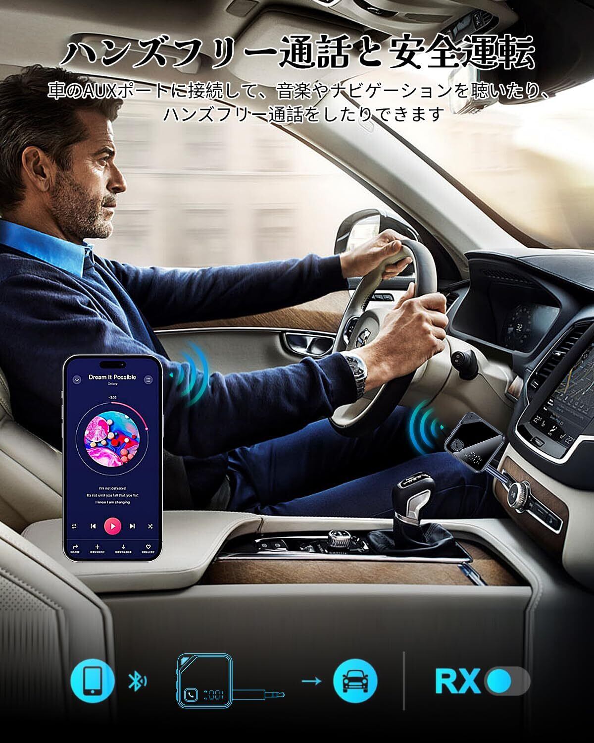 【複数のデバイスと幅広く互換性あり】ブルートゥース トランスミッターレシーバーは互換性が高く、iPhone、Androidスマートフォン、Bluetoothヘッドセット、タブレット、PC、テレビ、ステレオ、カーオーディオ、MP3/MP4、Switchゲームコンソールなど、Bluetooth機能と3.5mmオーディオ出力ジャックを備えたさまざまなデバイスに適しています。 ホームシーンでは、テレビやSwitchなどのゲームコンソールに接続し、周りの人に迷惑をかけずに、夜遅くでもワイヤレスヘッドホンで映画を楽しんだり、ゲームをしたりできます。 車シーンでは、車のAUXインターフェイスをRXモードで接続し、携帯電話のナビゲーションサウンドを車のオーディオから直接再生できるため、携帯電話で曲、ナビゲーション放送、ハンズフリー通話を聴くことができます。昔ながらのオーディオやアンプの場合は、3.5mmオーディオポートに接続し、受信モードをオンにするとBluetoothデバイスになり、音楽の世界に浸ることができます。