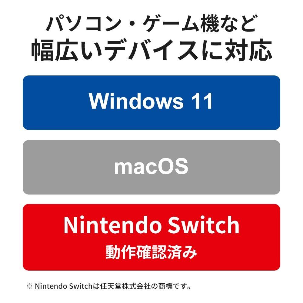 【挿すだけで使える&簡単セットアップ】Windows 11/10、macOS10.15以降、Nintendo Switchでドライバのインストールが不要で、挿すだけですぐ使えます。