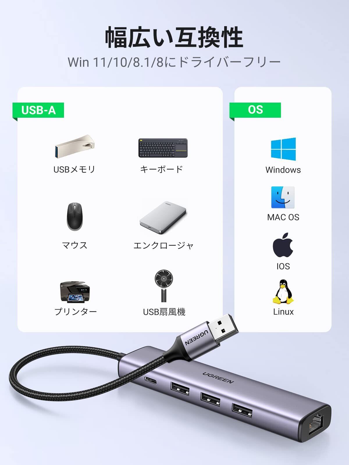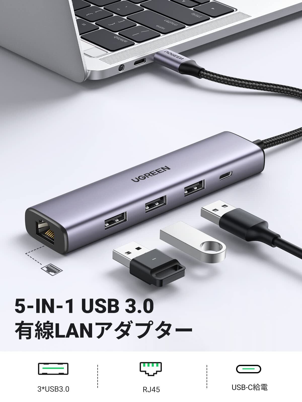 UGREEN USB 3.0 有線LANアダプター 1000Mbps ギガ 5-in-1 3*USB-Aポート 5Gbps高速転送 LAN ハブ RJ45 Switch/windows/macOS 対応