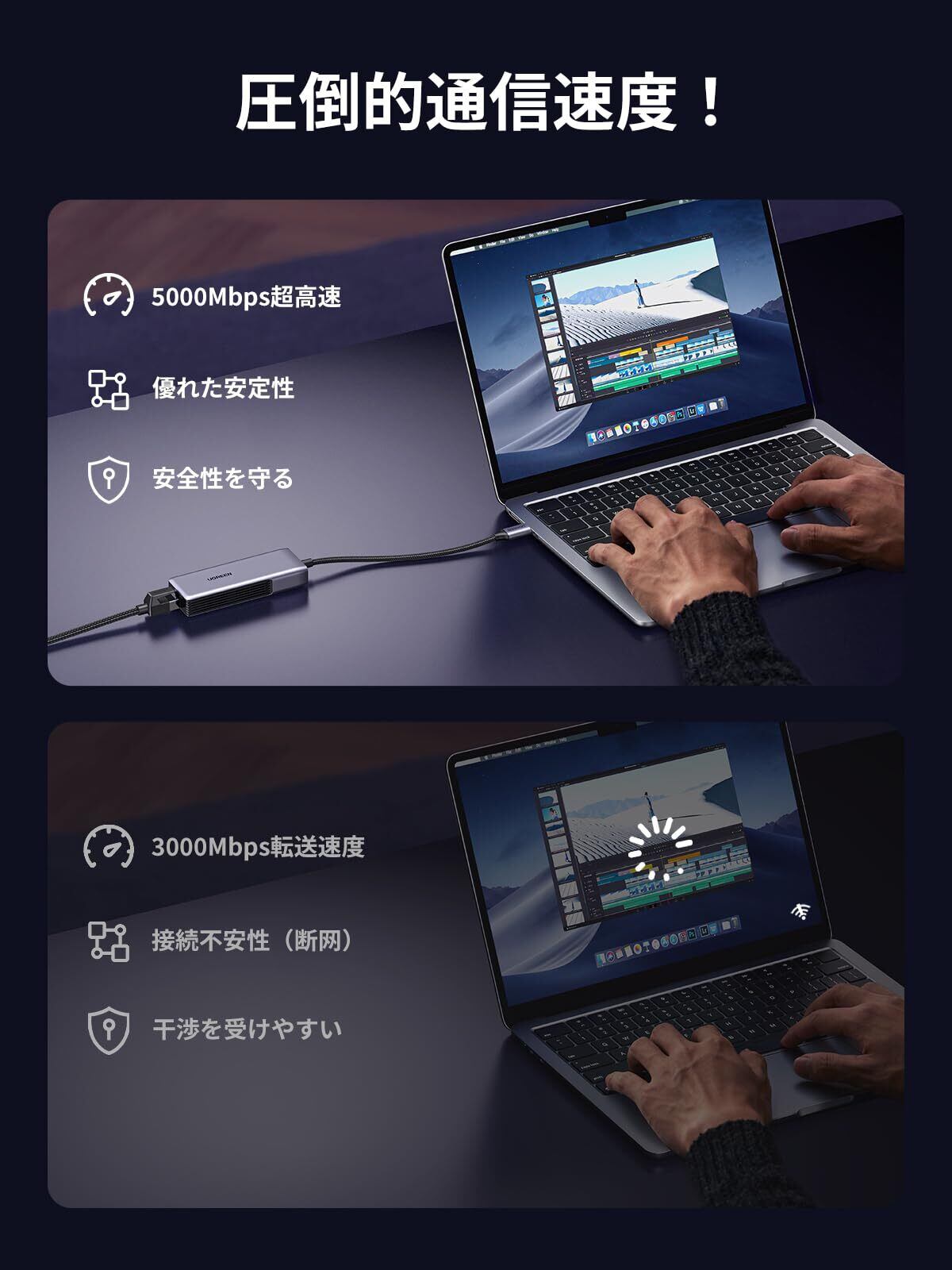 ▶【5Gbps安定した高速通信】本製品有線LAN アダプターはUSB 3.2 Gen 2 Type-Cポートにより、最大5Gbpsの超高速転送で、通常のギガビット・イーサネットより最大400%高速化になります。有線接続により安定した通信が可能となり、大きなファイルの転送や動画視聴、オンラインゲームが快適に!※5Gbpsでの通信をご利用いただくには、USB 3.2Gen 2規格以上のポートに接続する必要があります。