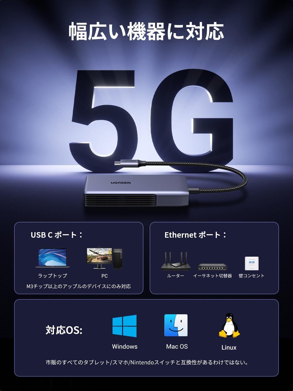 UGREEN 有線LAN アダプター 5Gbps Type C LAN 変換アダプター Thunderbolt 5/4/3には適用 アルミ素材 放熱性 USB C to RJ45 イーサネット アダプター ラップトップ Nas MacBook/XPS/Windowsには適用