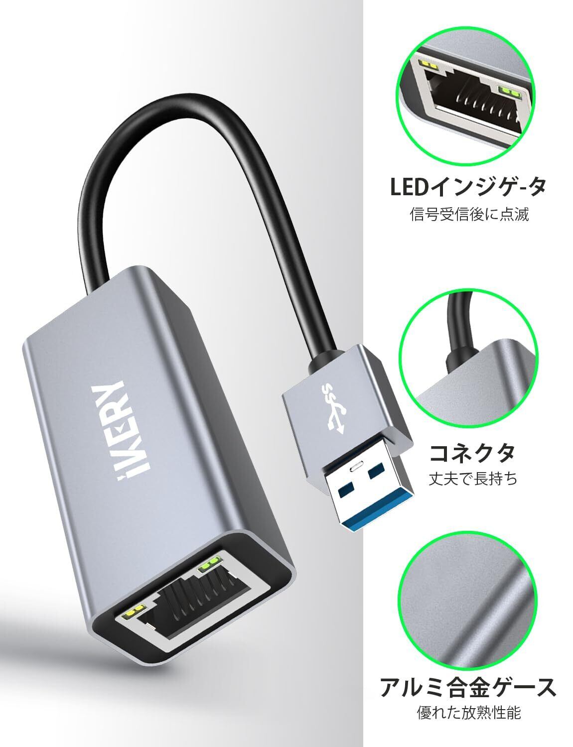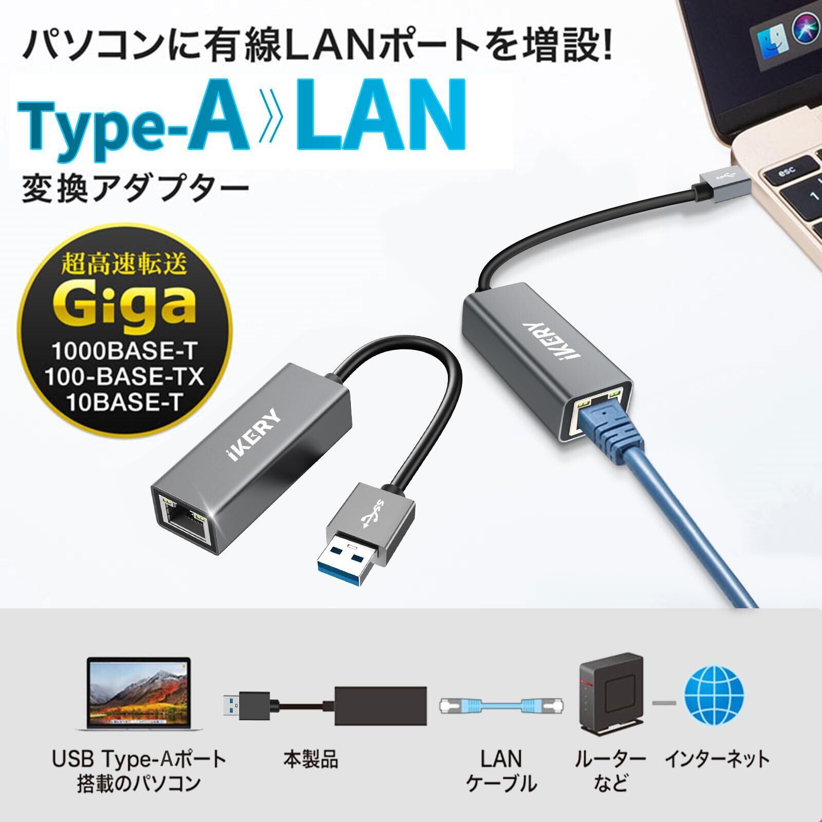 IKERY 有線LANアダプター usb-A イーサネットアダプター Type-A lan 変換アダプタ1000Mbps 高速 RJ45 ギガビット LAN ケーブル 変換コネクタ MacBook, iPad Pro, iMacなどに対応