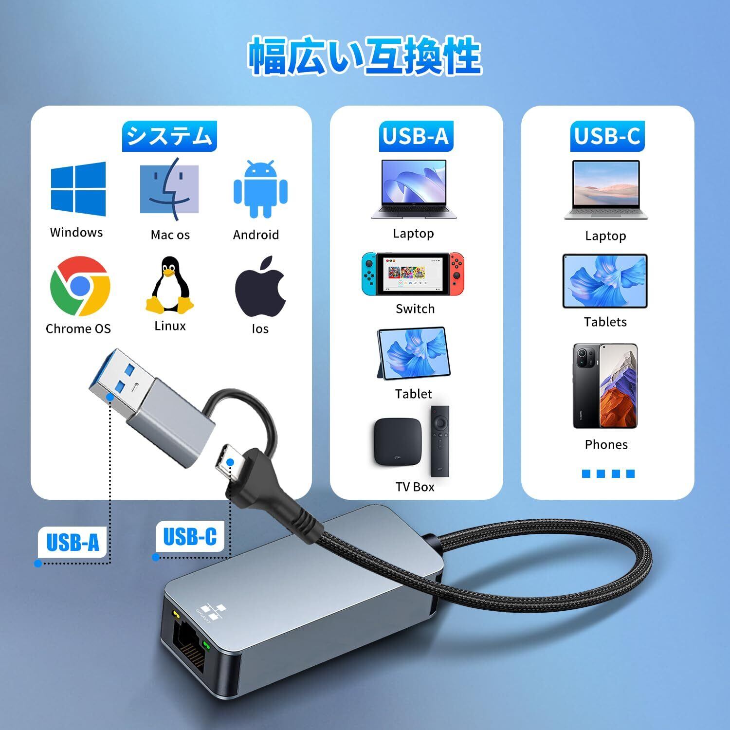 製品仕様 ネットワーク速度:最大 2500Mbps(2.5Gbps)の伝送レートをサポートし、10Mbps、100Mbps、1000Mbps のネットワーク速度にも互換性があります。 インターフェイスの種類:USB - C インターフェイスと USB - A インターフェイス(USB 3.0 規格)を備えています。 材質:筐体はアルミニウム製で、放熱に役立ちます。 システムの互換性:Windows 10 以降のバージョン、macOS 10.14 以降のバージョン、iPadOS システムをサポートしています。
