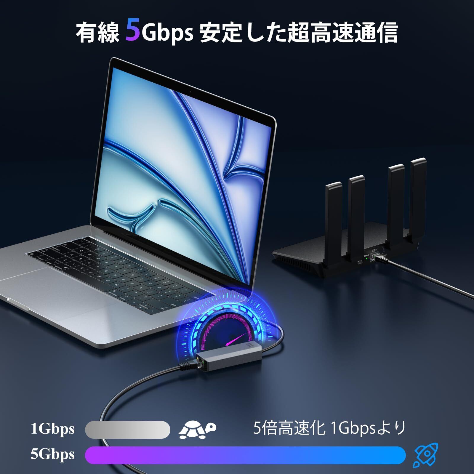 【超高速 5Gbps 有線LANアダプター 】このUSB有線LANアダプターは最大5Gbpsの通信速度を実現し、IEEE 802.3u(10/100Mbps)、IEEE 802.3ab(1000Mbps)、IEEE 802.3bz(2500/5000Mbps)規格に完全準拠しています。10G規格対応のUSB Type-Cインターフェースを搭載し、5Gネットワークの全速度伝送を簡単に実現できます。大容量ファイル転送、4K/8Kビデオストリーミング、リアルタイムバックアップなど、高帯域幅を必要とする様々なシナリオに最適です