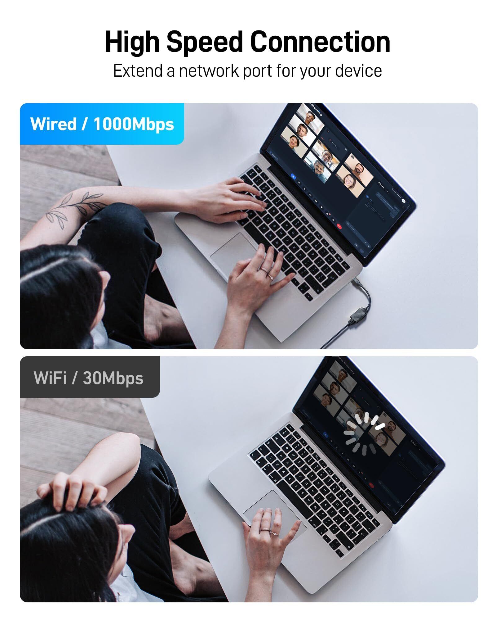 【真のプラグアンドプレイ】USB-Cトランスイーサネットアダプタはすぐに有線ネットワークに接続できます。ドライバ、ソフトウェア、その他のいじりをダウンロードする必要はなく、接続するだけでフルスピードでインターネットを楽しむことができます。しかも小さくて軽いので、ノートパソコンのバッグに入れて持ち歩くことができます。