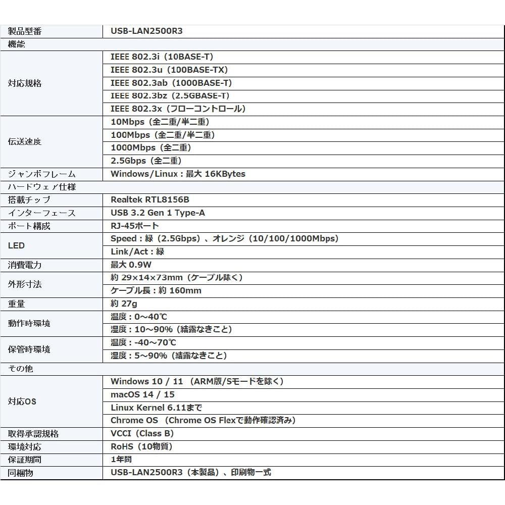 REALTEK社製2.5GbEコントローラーチップ「RTL8156B」を搭載した2.5Gbps USB有線LANアダプター(USB Type-A)です。 省電力設計や最大16KBytesのジャンボフレーム対応により、安定した高速通信を実現。 Windows、macOS、Linux、Chrome OSなど幅広いOS環境で、USB Type-Aポートを備えたパソコンやタブレットをマルチギガビット有線LANに接続することができます。