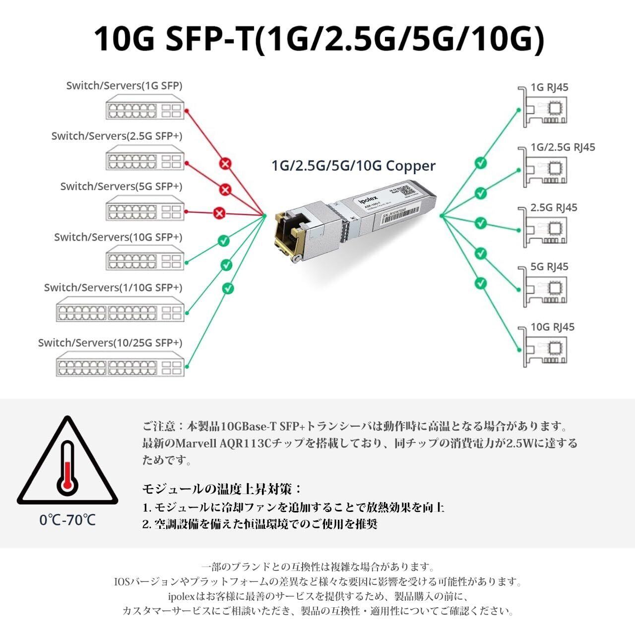 ipolex 10GBase-T SFP+モジュール 1.25/2.5/5/10G SFP+ RJ45 モジュール Cisco SFP-10G-T-S、Netgear、Ubiquiti、D-Link、Supermicro、TP-Link、Broadcom、Linksys、F5など対応互換 マルチレート 光トランシーバー 最大30m (CAT.6a/ CAT7)