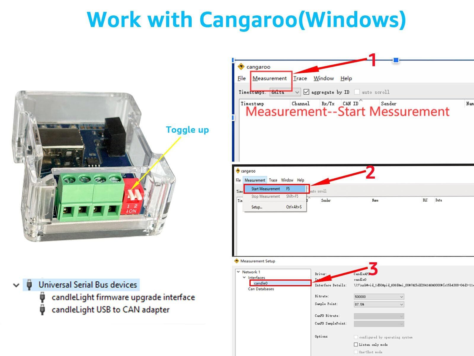インターフェース:CAN-H、CAN-L、グランドピン、内蔵120オームスイッチ、プログラミングスイッチ(DSD TECHはUSB CANアダプターにこのスイッチ設計を初めて採用)。