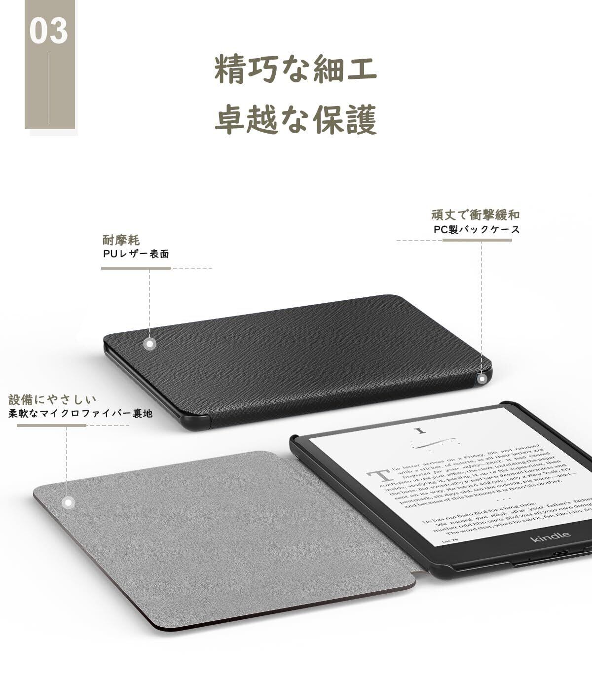 「上質な素材採用」 このKindle Paperwhite 2024(第12世代)/Kindle Colorsoft 2025(第1世代)用のカバーは上質なPUレザーとマイクロファイバー素材を採用し、画面を保護しきれいに保つと同時に、高級感とファッション性を感じさせられます。