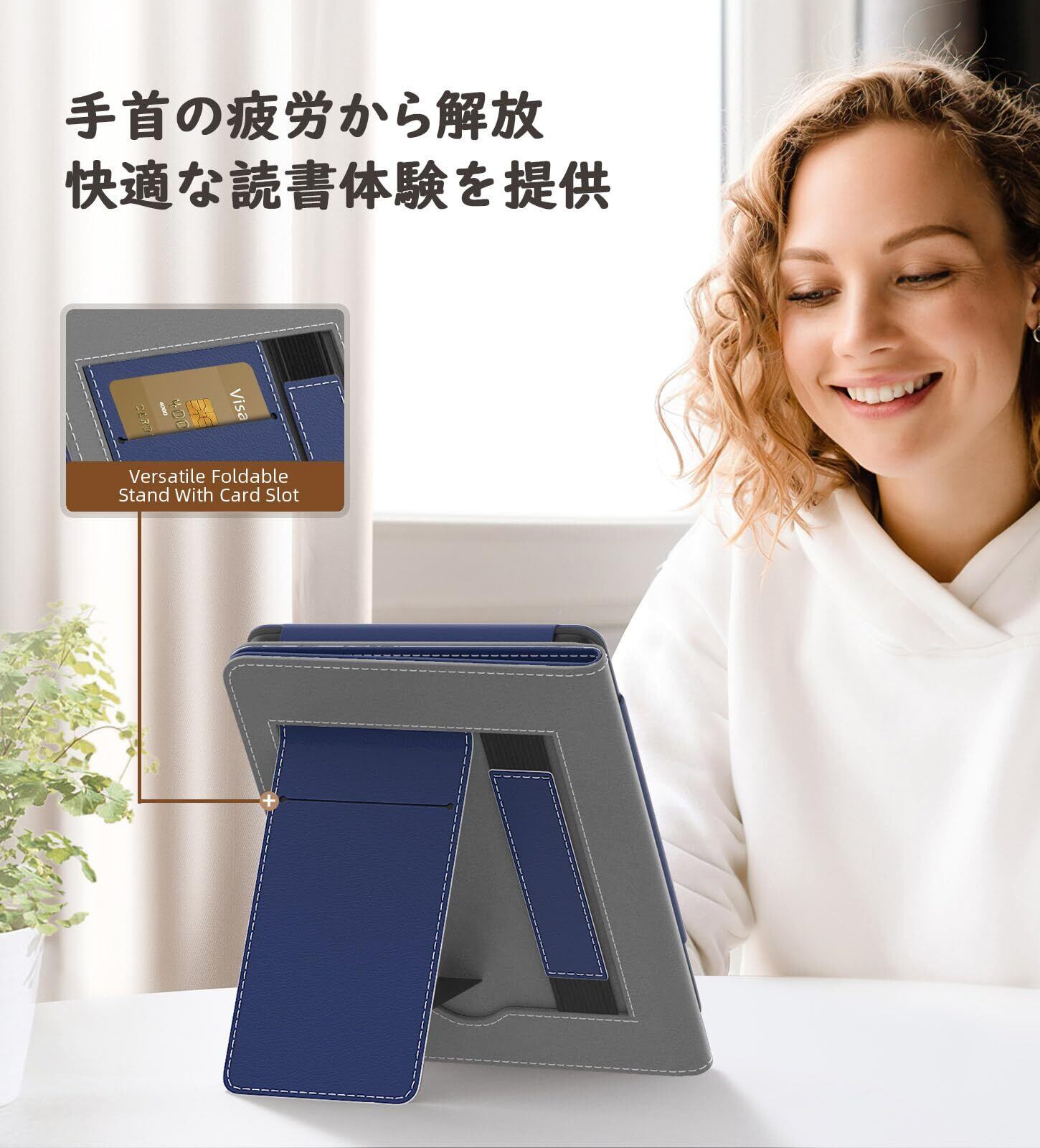 「快適な読書体験をサポート」ケースに内蔵されたスタンドデザインにより、Kindleを立てて快適に読書を楽しむことがサポートしてくれて、両手を解放し、コーヒーなどを飲みながら読書をし、のんびりと余暇時間を過ごすことができます。
